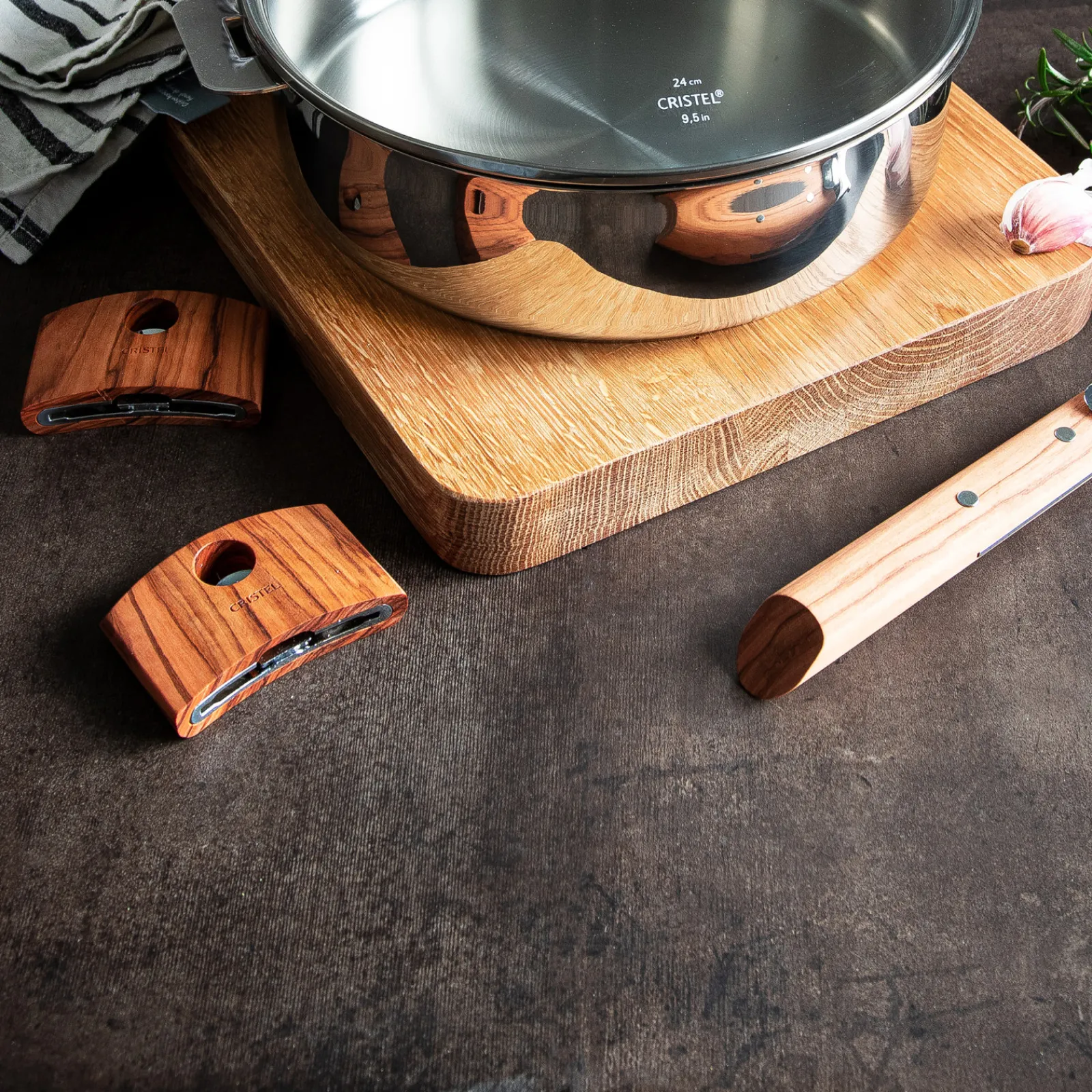 Les anses en bois amovibles Casteline se manipulent d’une seule main et se verrouillent automatiquement.