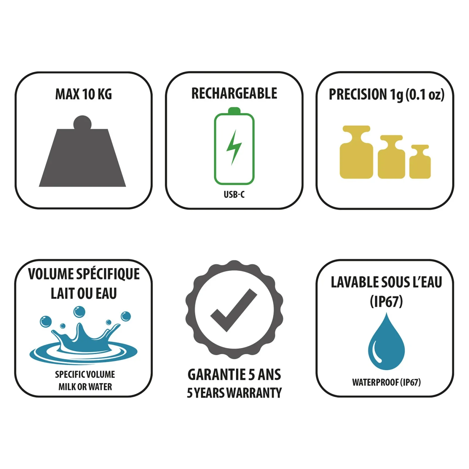 Elle est équipée de la fonction TARE et possède des fonctions spécifiques pour mesurer les volumes de liquides tels que l’eau ou le lait, garantissant une cuisine précise pour toutes vos recettes.