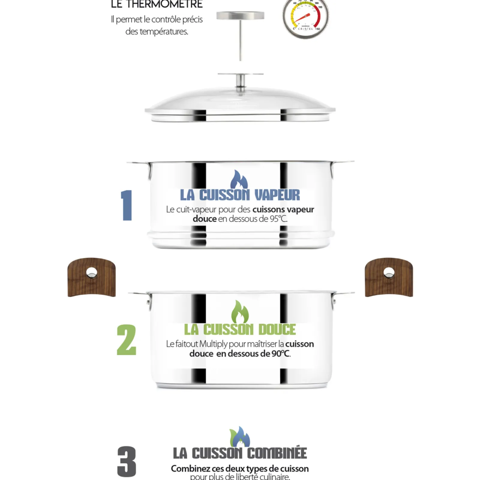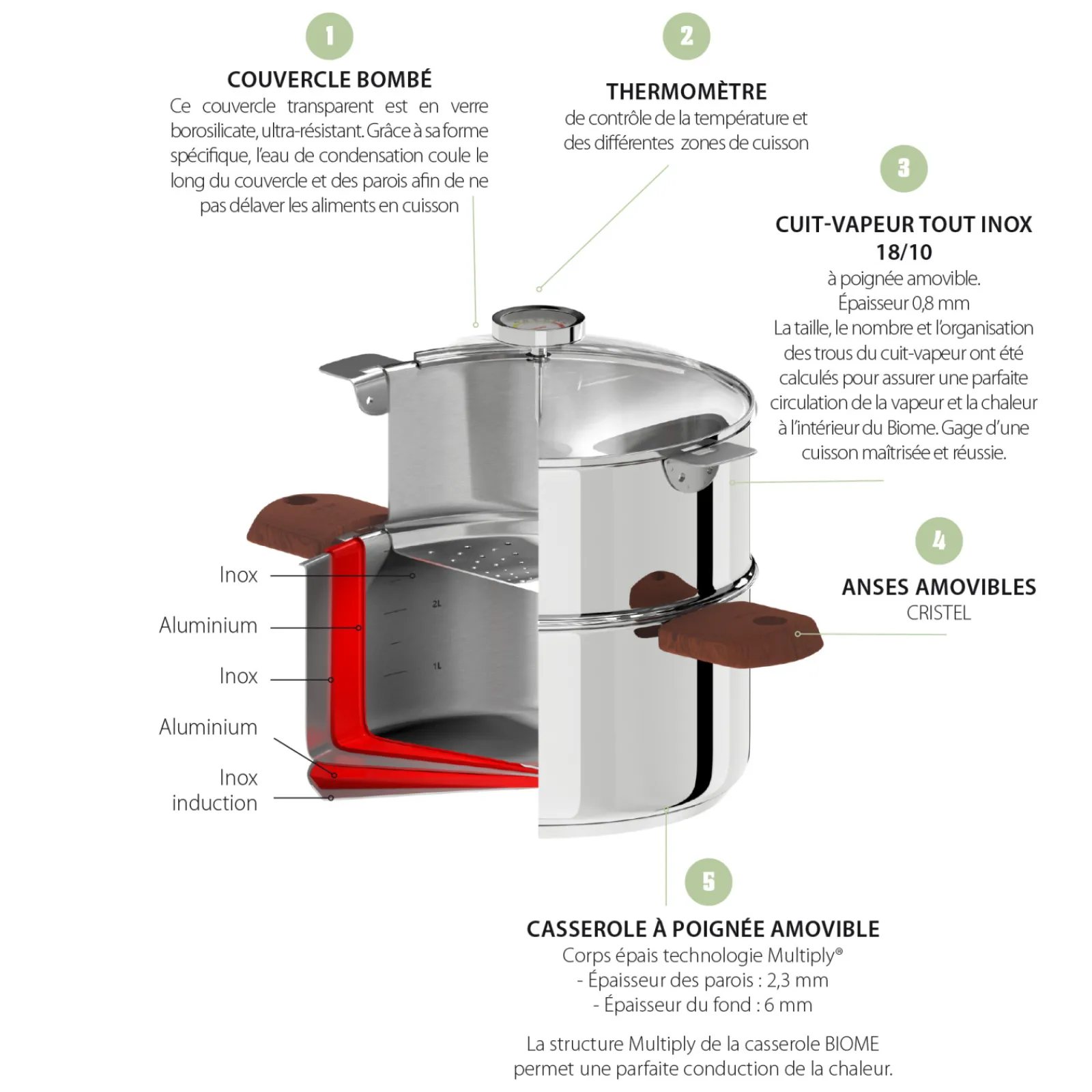 Biome est un cuiseur qui allie trois modes de cuissons différentes : douce (en dessous de 90°C), vapeur (en dessous de 95°C) et le mixte des deux. Le thermomètre allié au couvercle en verre ultrarésistant permet la maîtrise de la température.