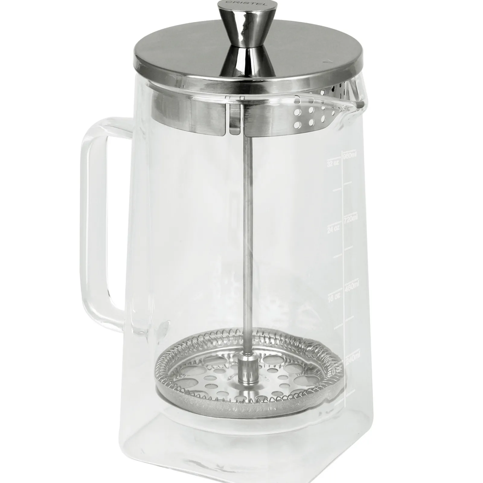 Nouvelle cafetière à piston CRISTEL, entièrement démontable, tout inox. Disponible en trois tailles : 3, 5 et 8 tasses.