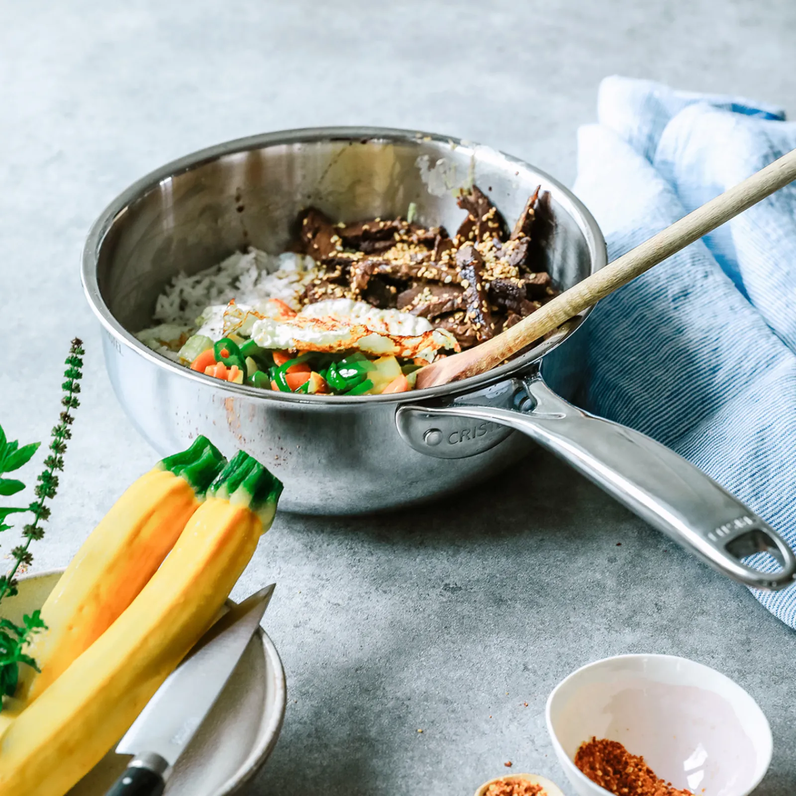 Les 5 couches superposées (inox 18/10 + 3 couches d’aluminium + inox induction), permettent une diffusion homogène de la chaleur dans tout le corps de l’ustensile de cuisson, en partant du fond jusqu’aux bords. L’absence de fond rapporté justifie une rapidité de montée et de descente de la température et facilite la cuisson des appareils les plus techniques. La forme unique tout en rondeur du corps de l’ustensile est idéale pour mélanger, cuire et monter les sauces.