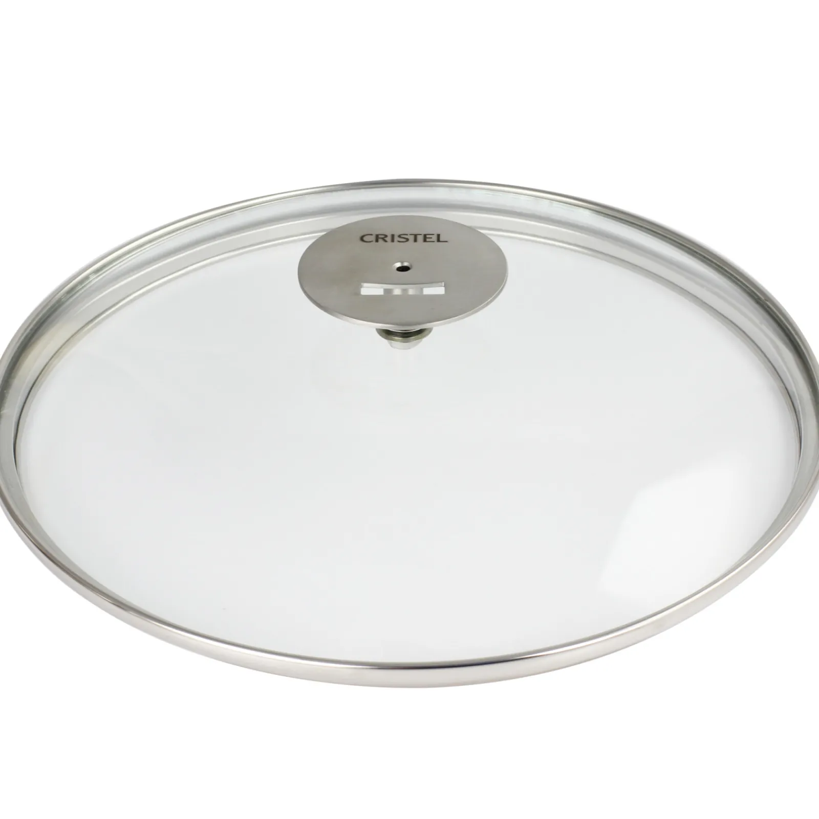Couvercle en verre cerclé d’inox avec trou permettant le passage du thermomètre Biome.Bouton inox siglé CRISTEL.La f…