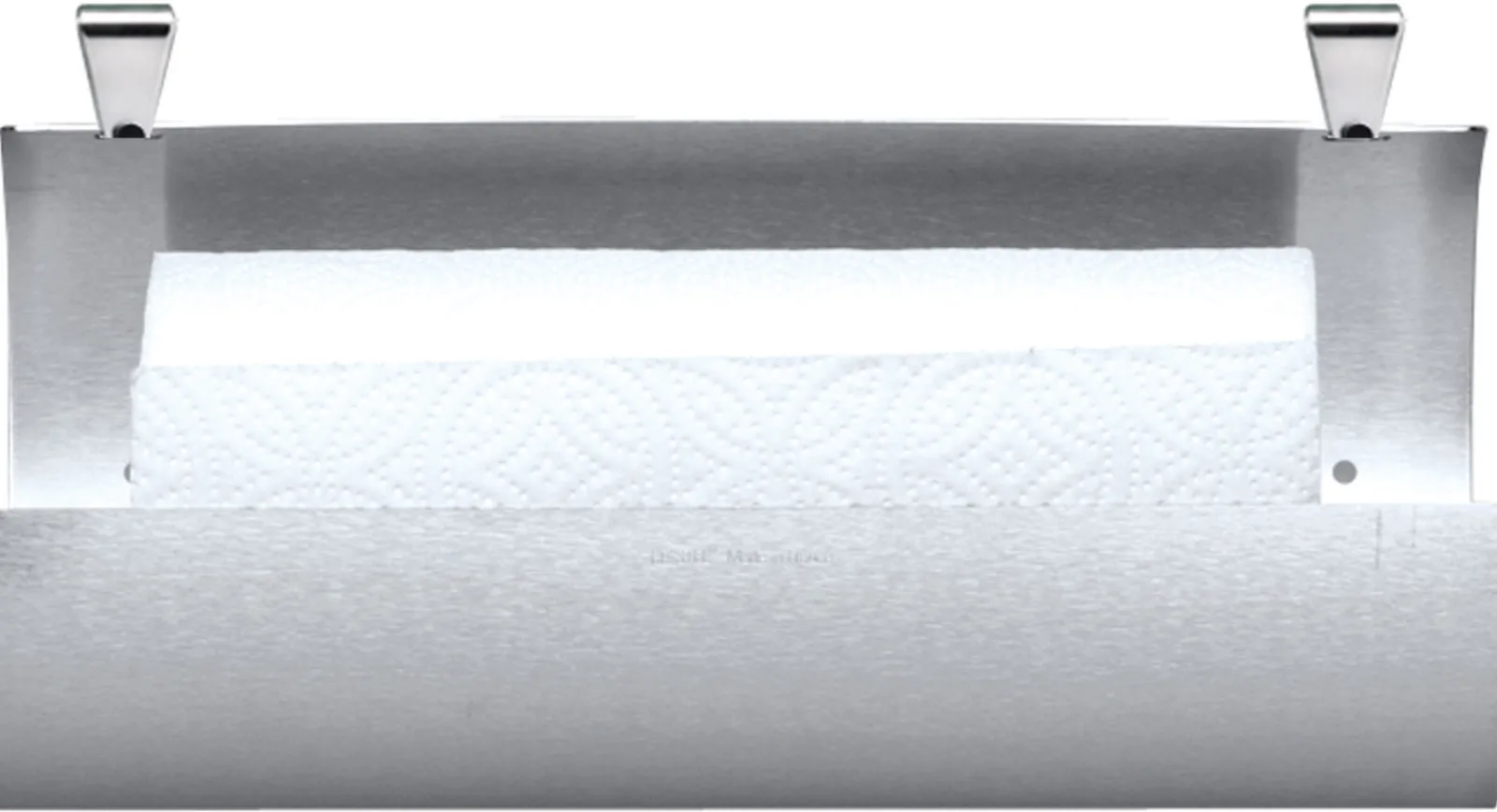 Simple feuille d’inox pour y déposer un rouleau de papier essuie-tout que l’on découpe à volonté sur la tranche.