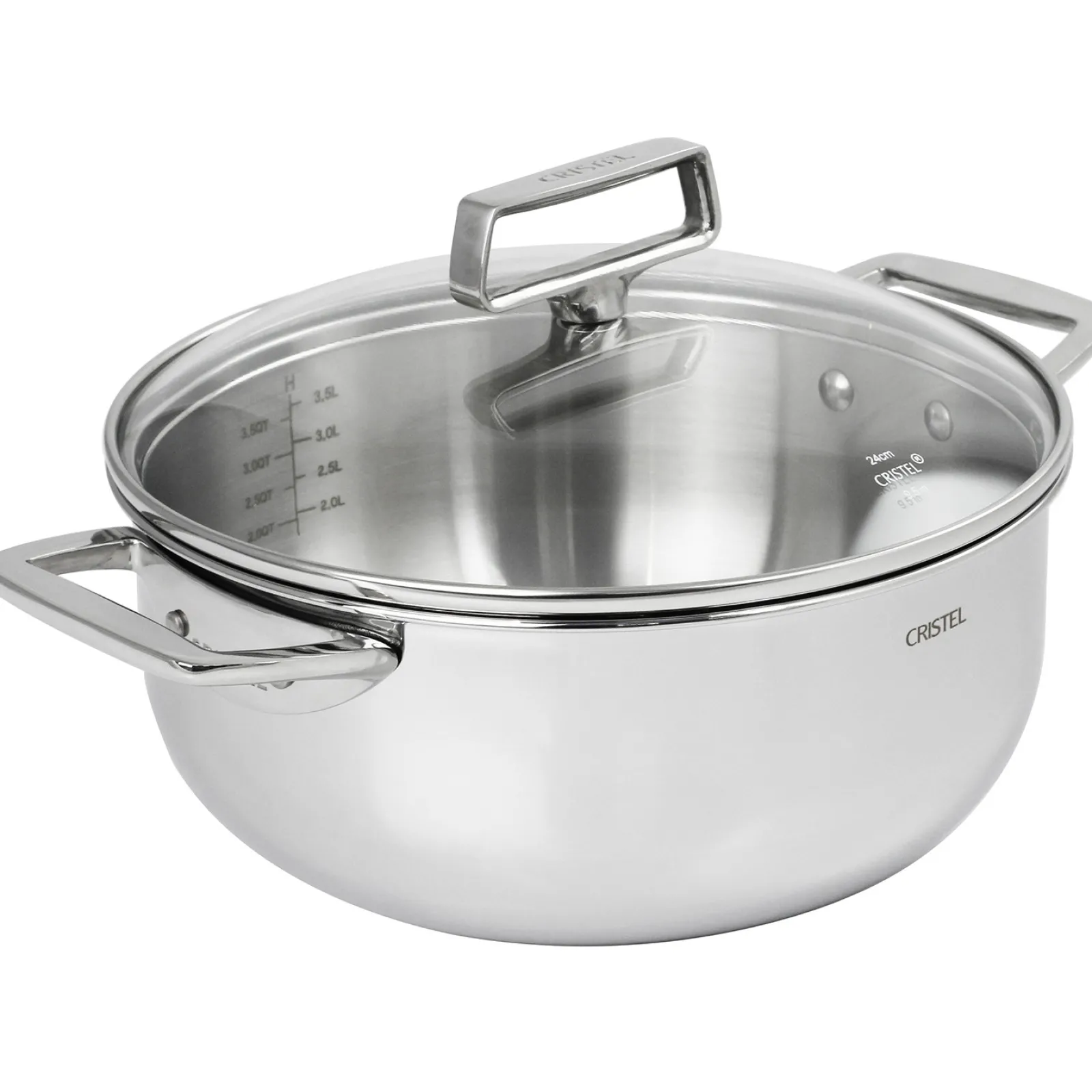 Sa poignée ergonomique en fonte d’inox, siglée CRISTEL, offre une excellente préhension sans risque de brûlure.