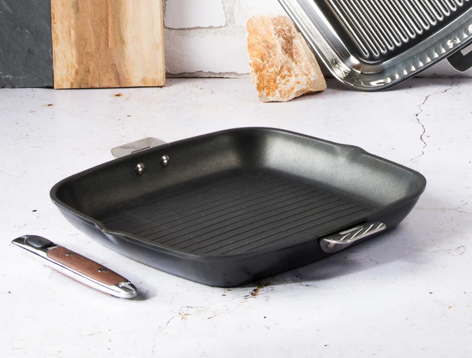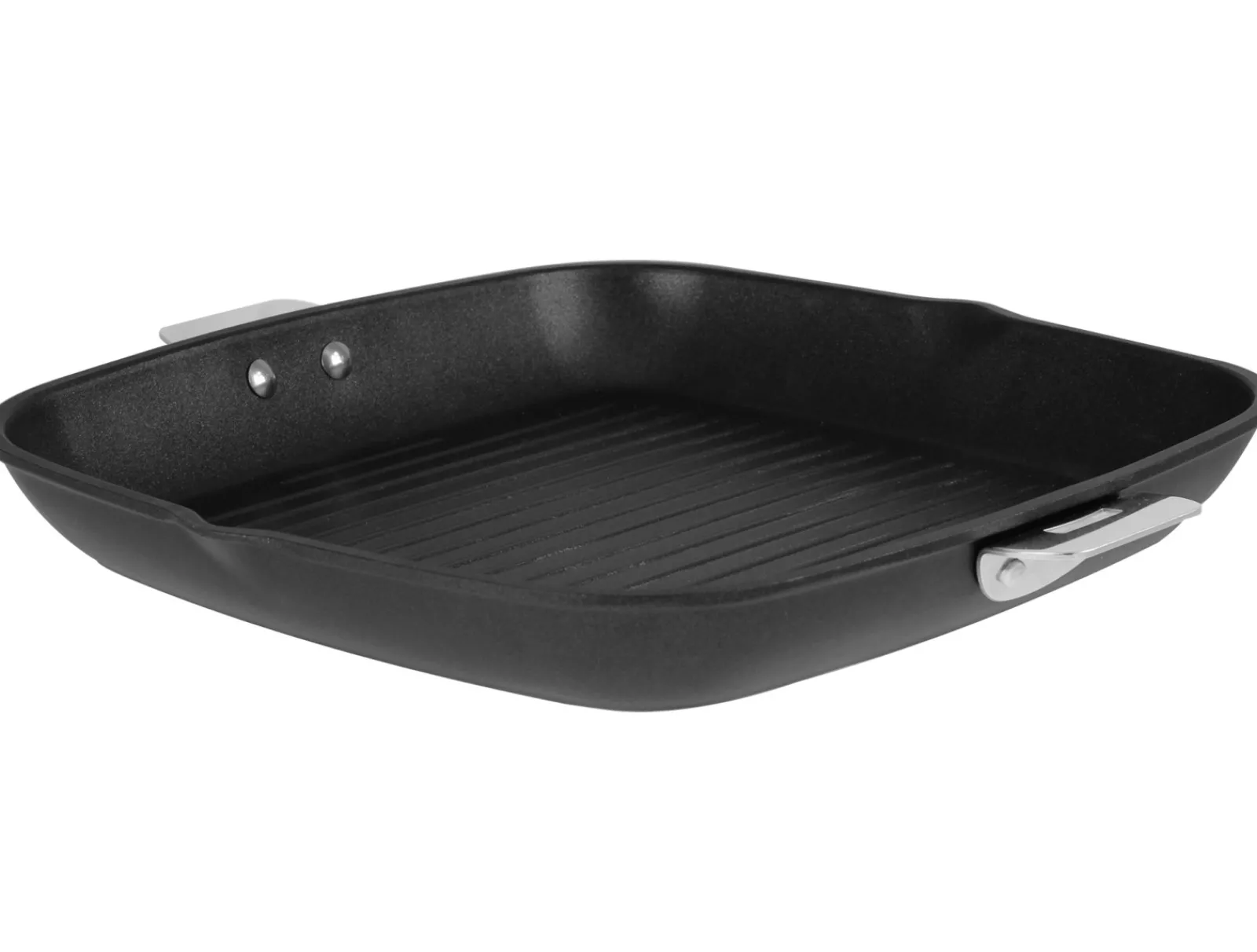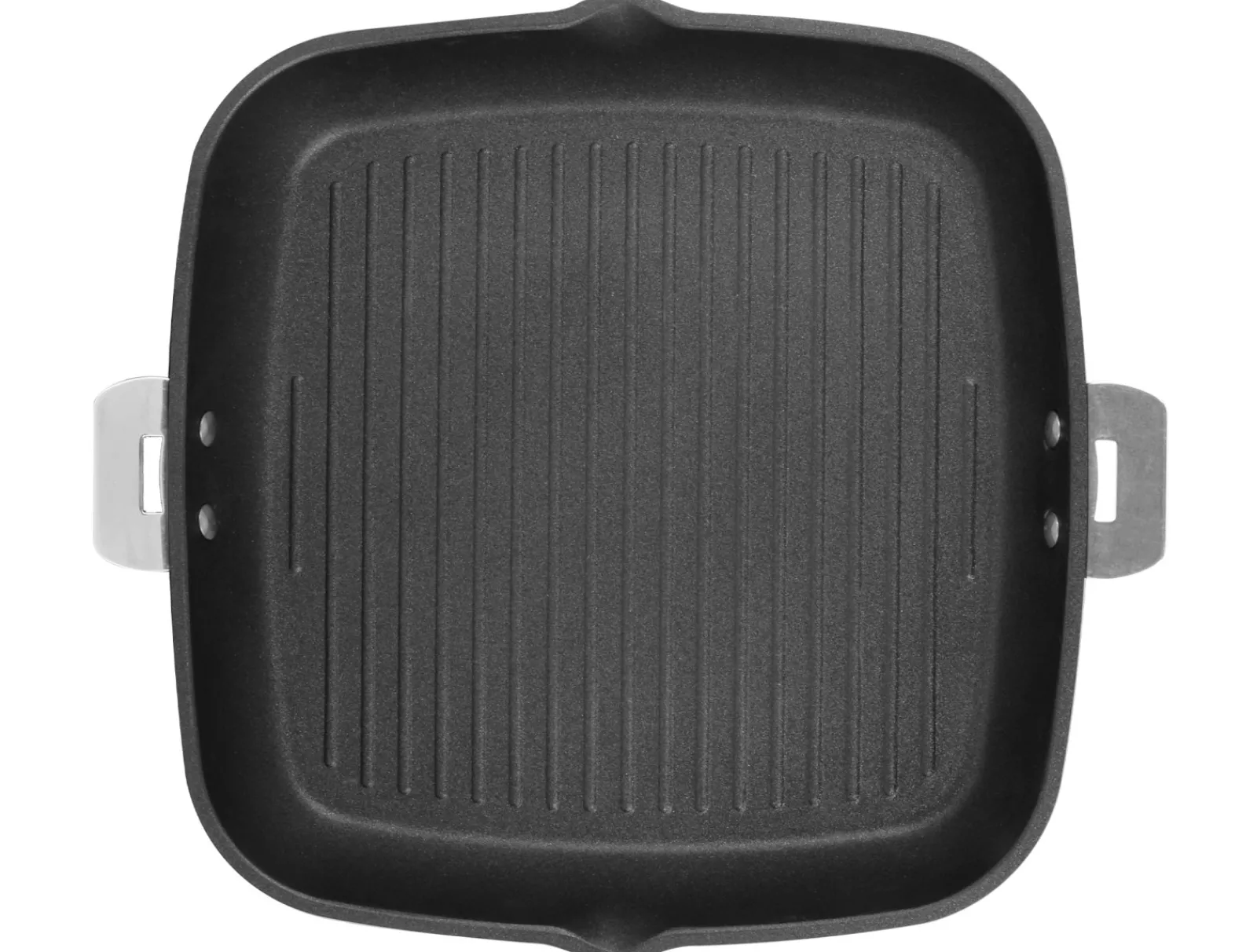 Gril carré, format 28 x 28 cm, en construction Ultralu revêtu de l’antiadhésif ultra-résistant Exceliss+ sans PFOA ni PFOS.