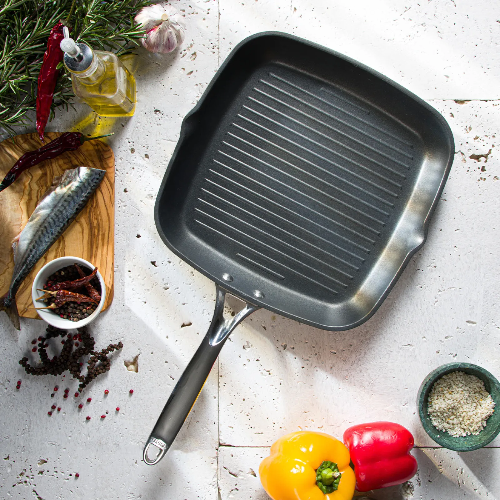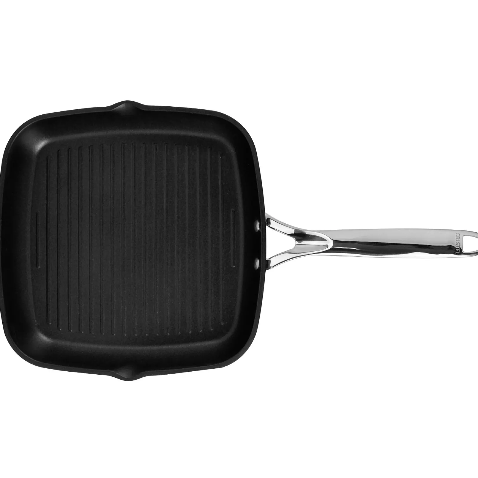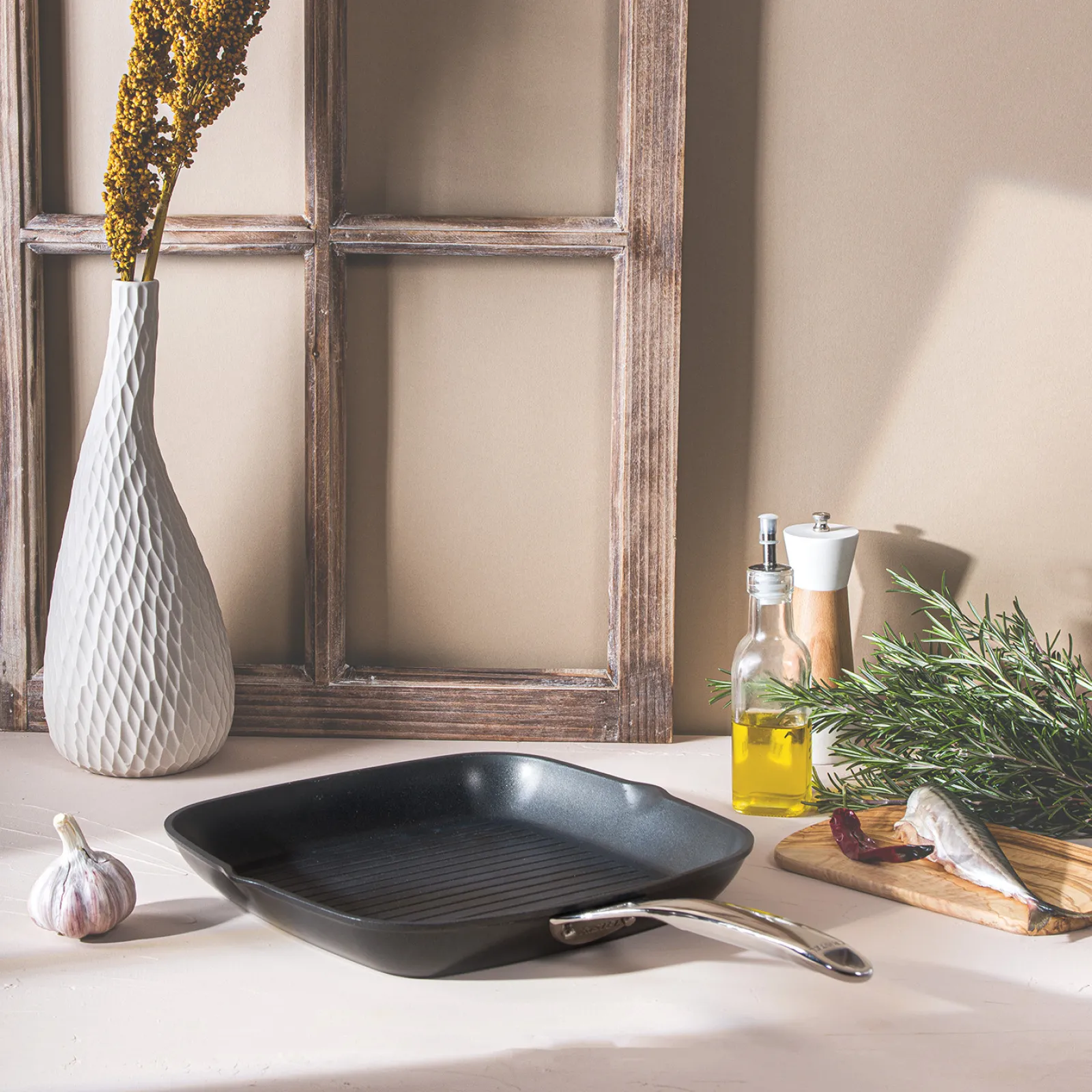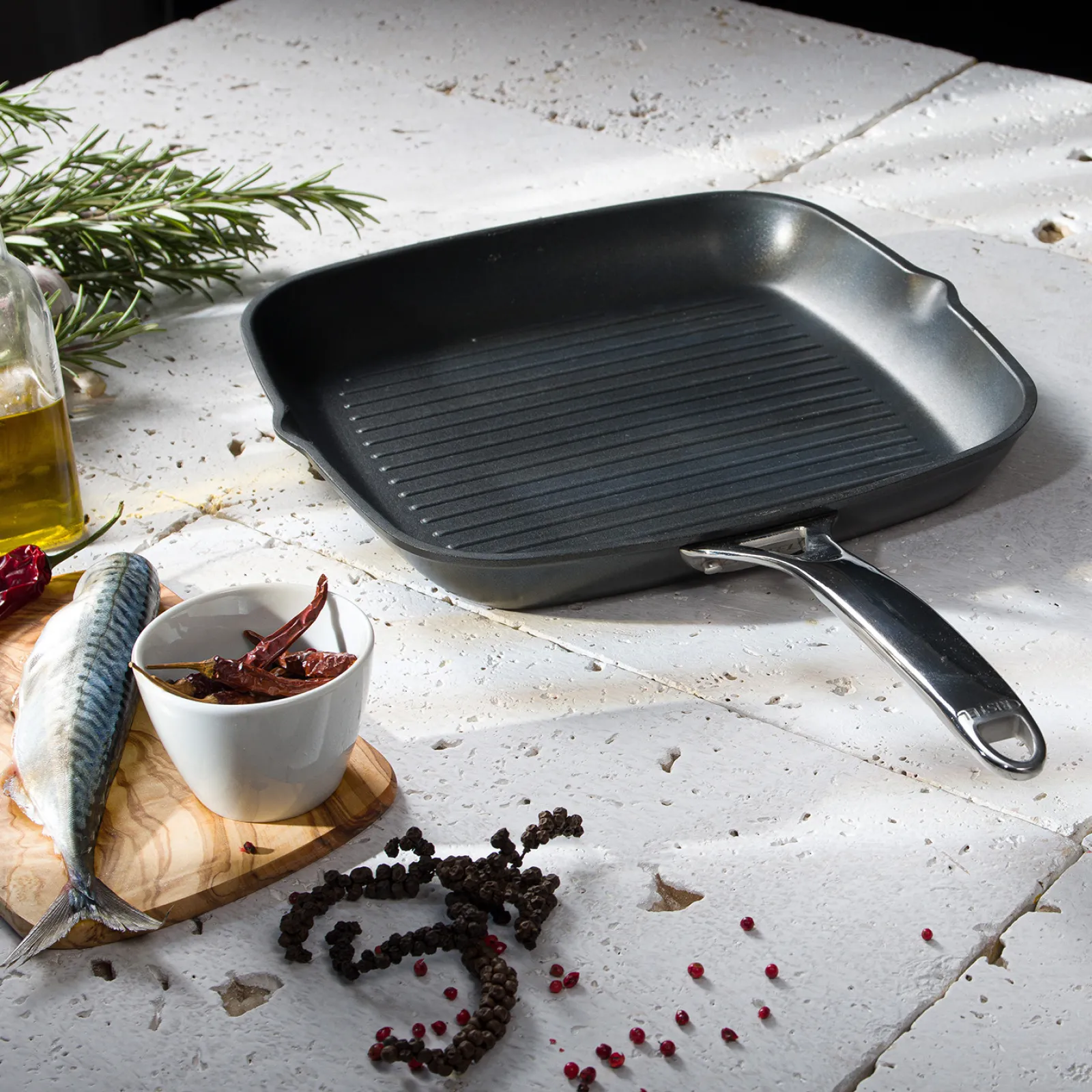 Gril carré, format 28 x 28 cm, en construction Ultralu revêtu de l’antiadhésif ultra-résistant Exceliss+ sans PFOA ni PFOS.