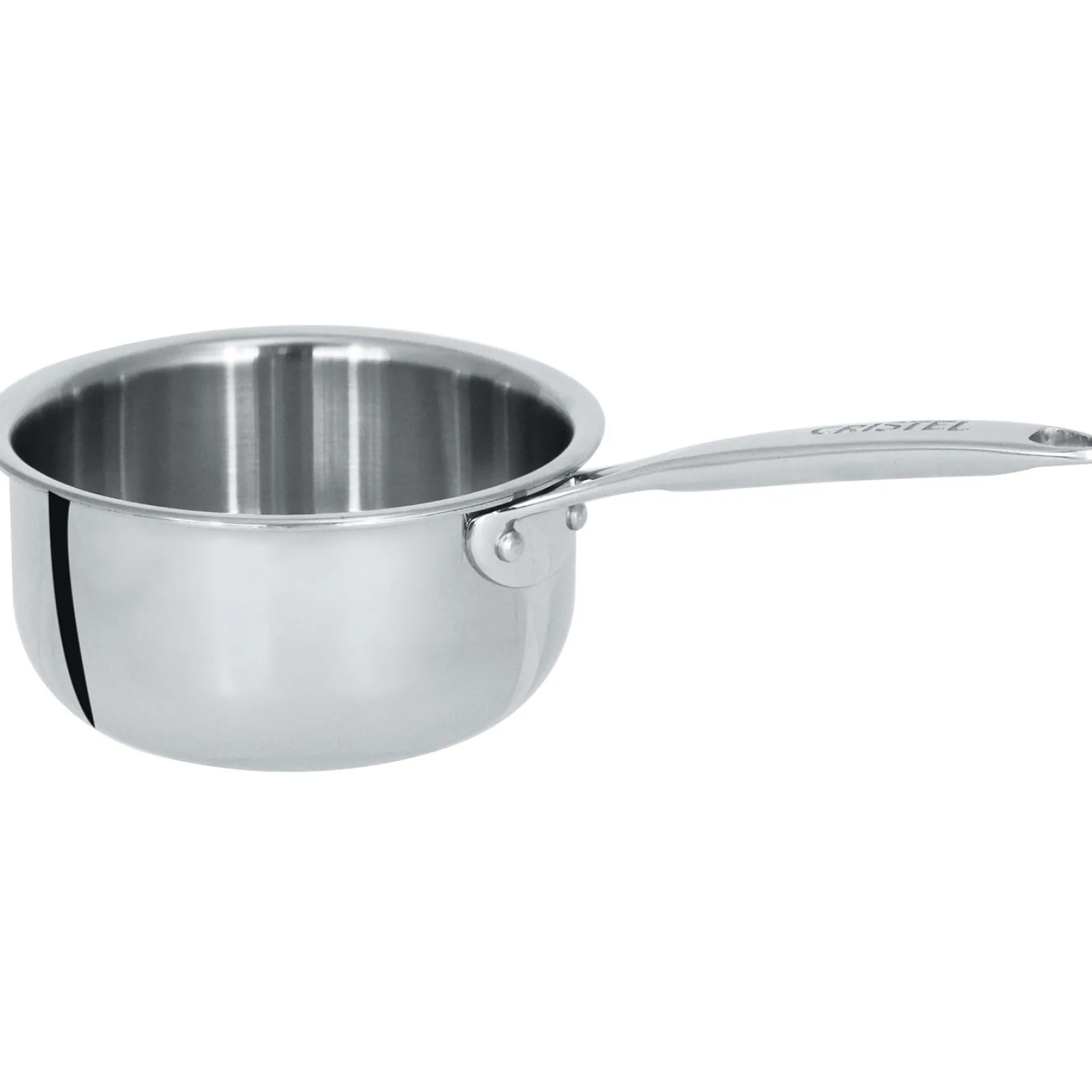 Mini Casserole inox 3-ply collection Castel’Pro, finition brillante miroir avec corps thermo-diffuseur 3 couches, poignée fixe en fonte d’inox.