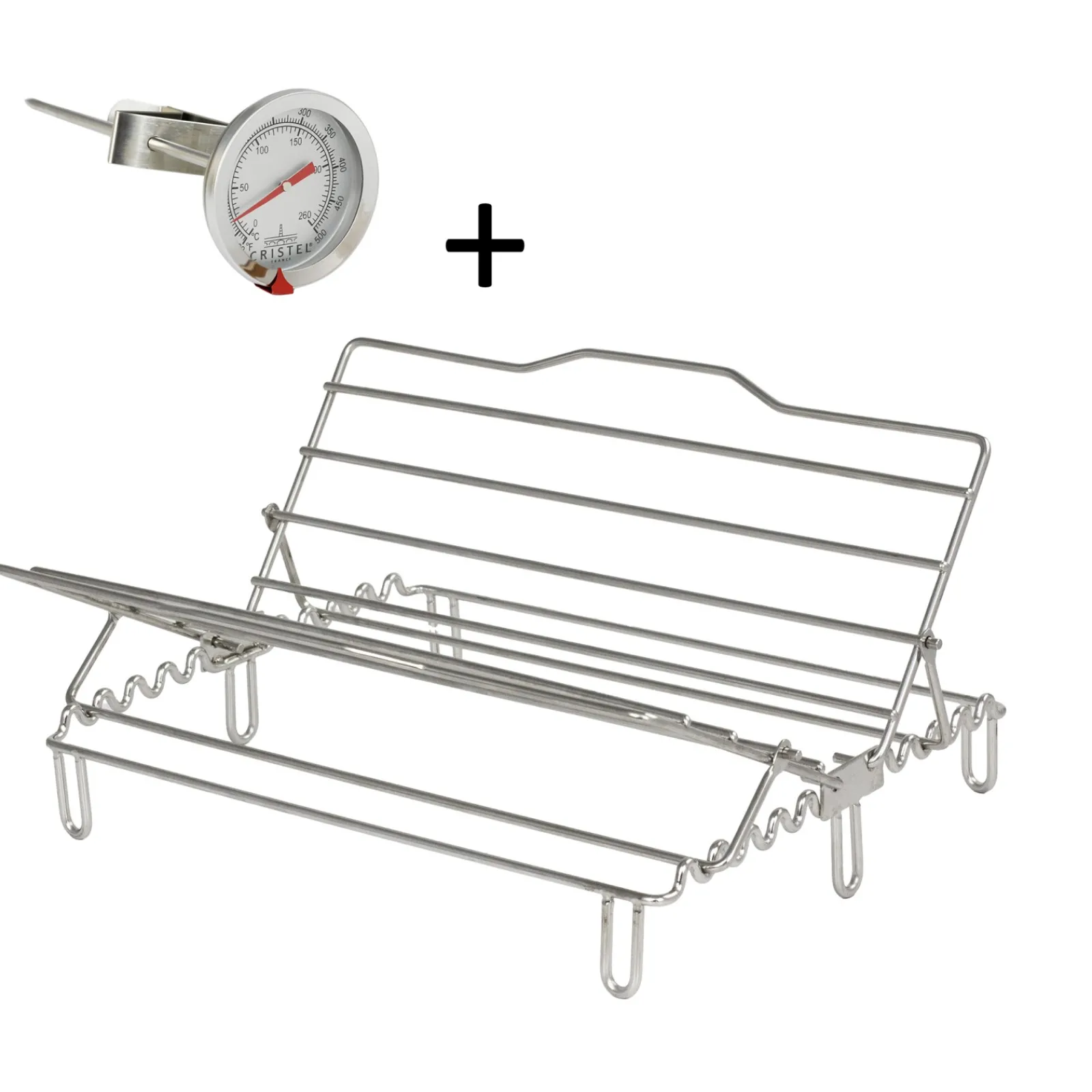 La grille-berceau est en fil inox réglable et rabattable pour un rangement peu encombrant mais aussi pour une utilisation en position horizontale (cuisson au four de poissons, cotes de boeuf, carré d’agneau etc.).