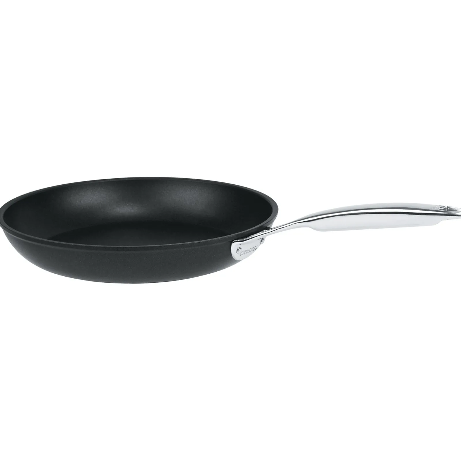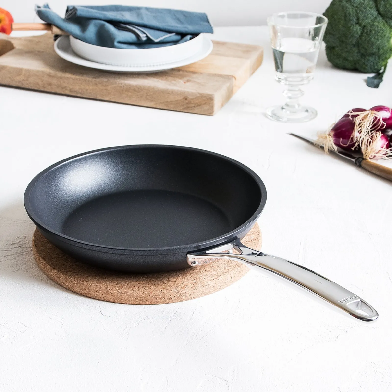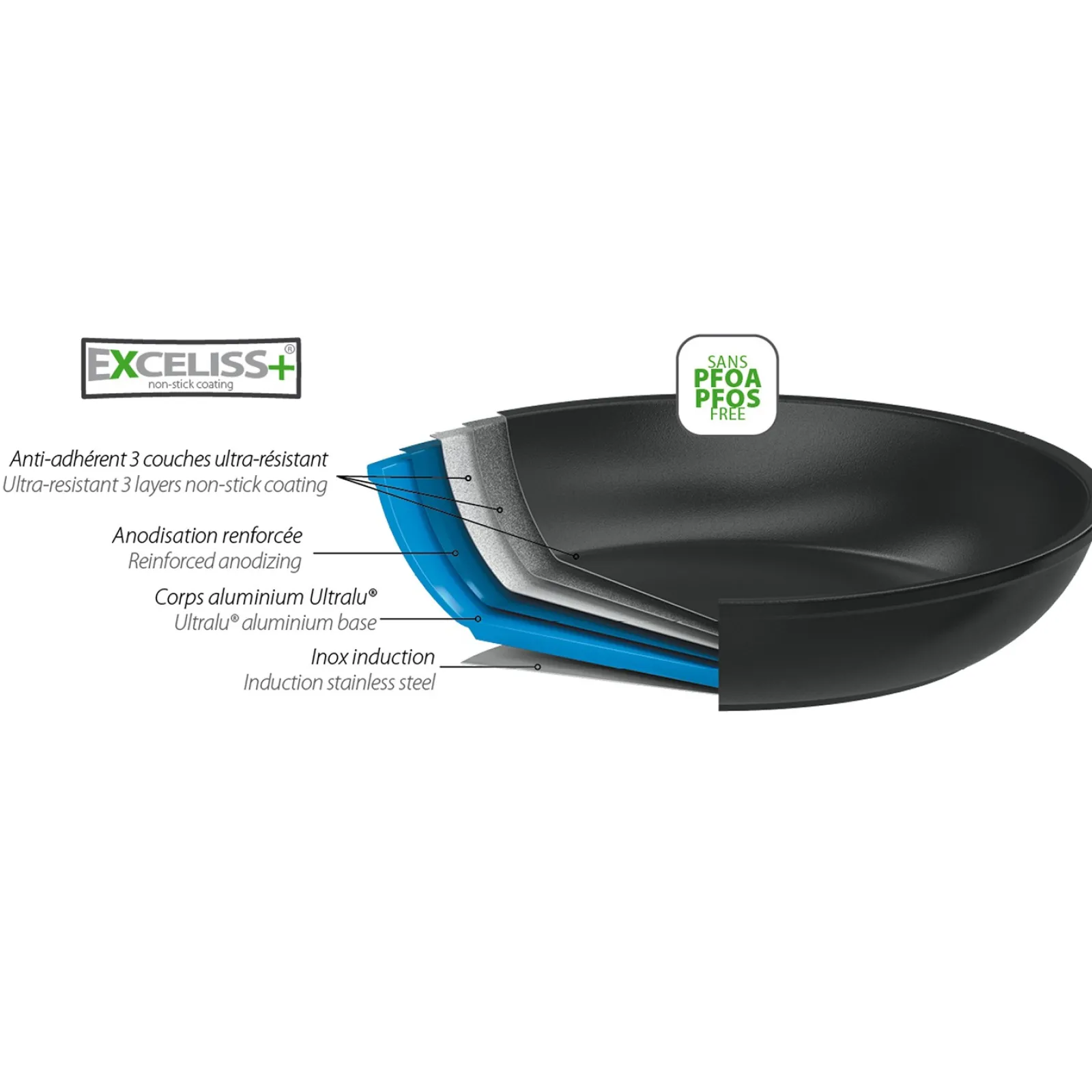 Poêle en aluminium, poignée en inox rivetée et revêtement anti-adhésif Exceliss®+ sans PFOA et sans PFOS.