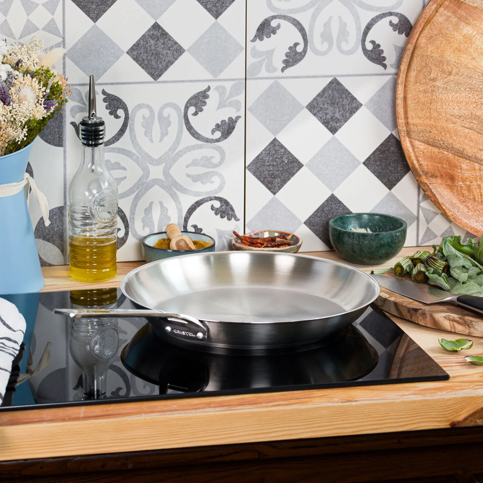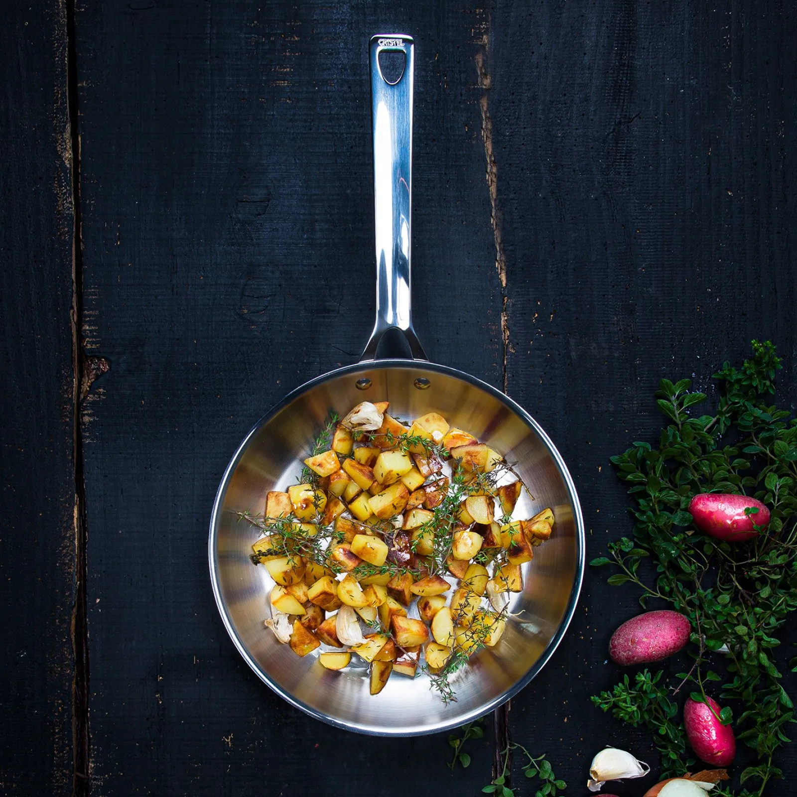 Équipée d’un fond rapporté thermo-diffuseur en trois couches superposées (inox induction – aluminium – inox 18/10), la poêle CRISTEL 1826 garantit une répartition uniforme de la chaleur sur toute sa surface, permettant de griller facilement une pièce de viande ou de faire revenir une poêlée de légumes, sans ajout de matière grasse.
