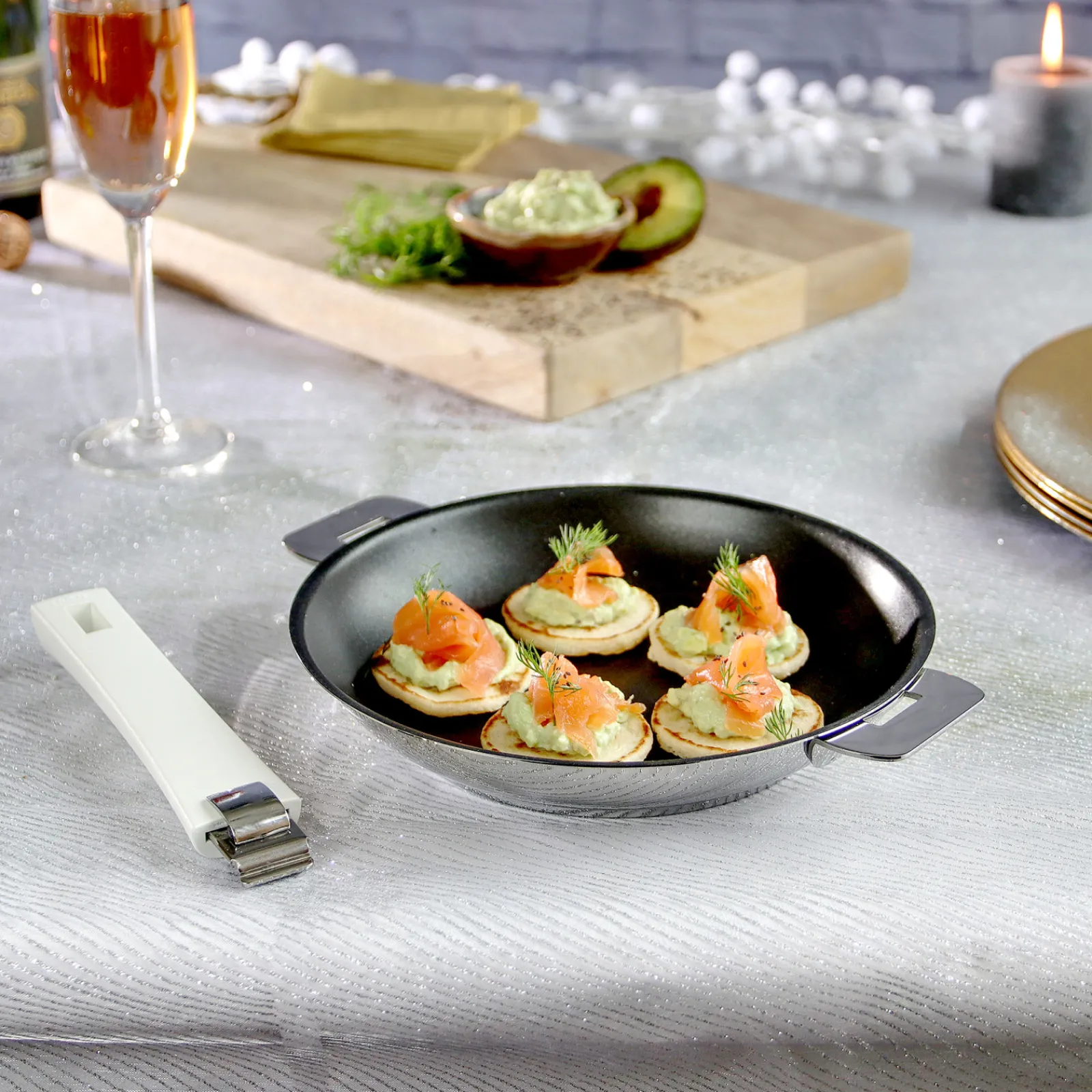 Poêle haute « type lyonnaise » en inox 18/10 à poignée amovible, finition brillant miroir, avec revêtement anti-adhésif Exceliss+. Collection Mutine Amovible.