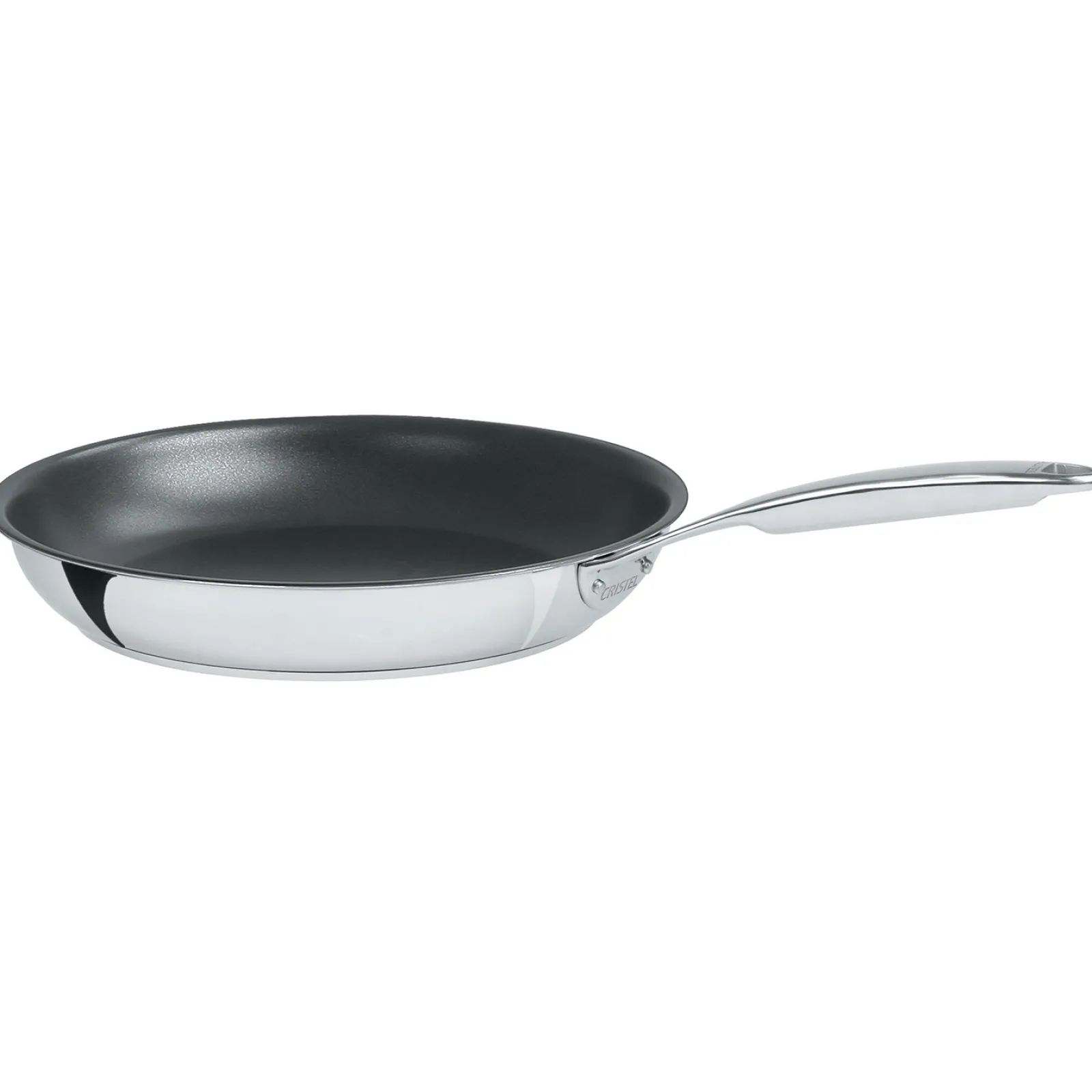 Poêle inox 5-ply collection Castel’Pro, finition brillante miroir avec antiadhésif ultra résistant Exceliss+, sans PFOA ni PFOS. Poignée fixe en fonte d’inox.
