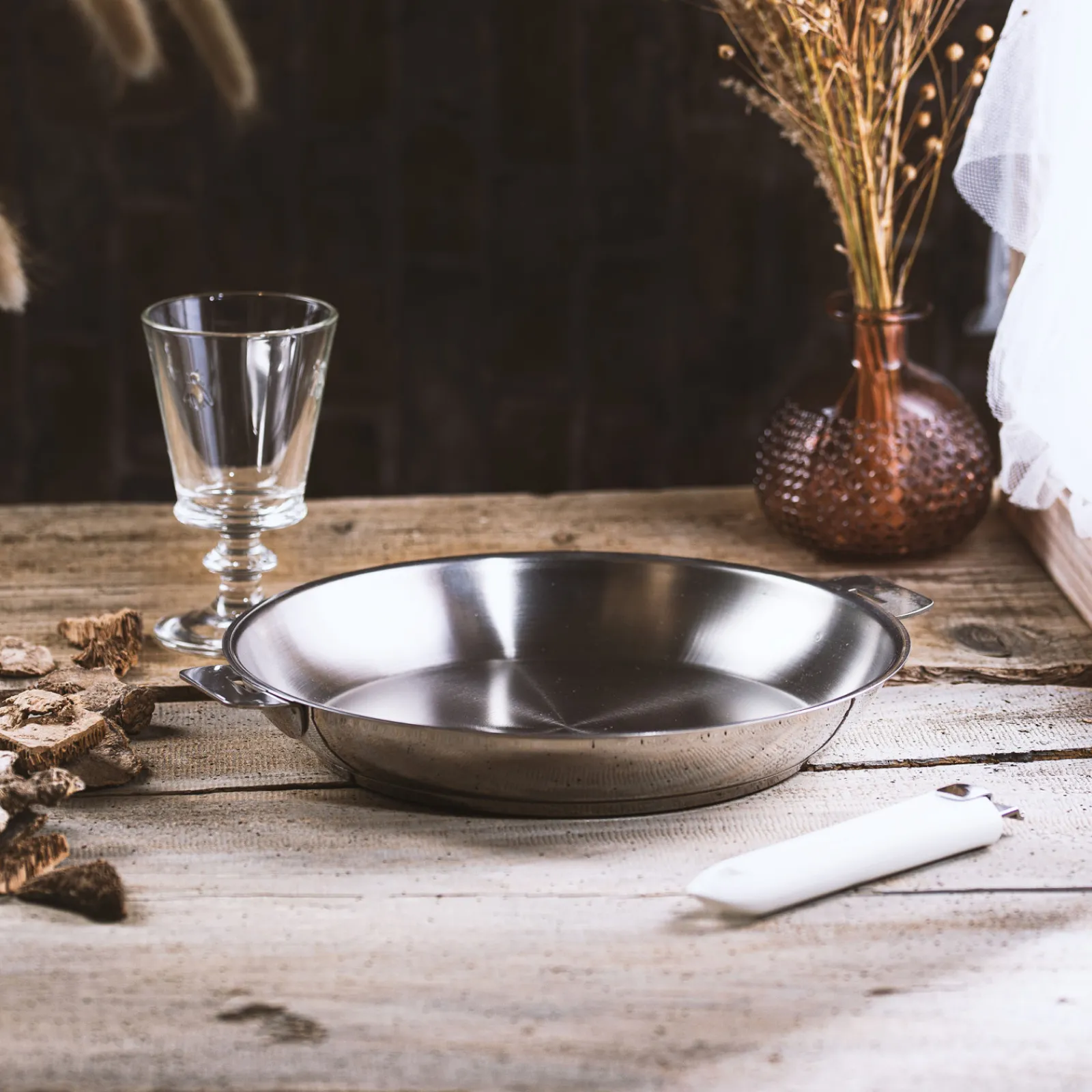 Sans poignée, la poêle inox Mutine se transforme en plat et permet de terminer une cuisson au four.