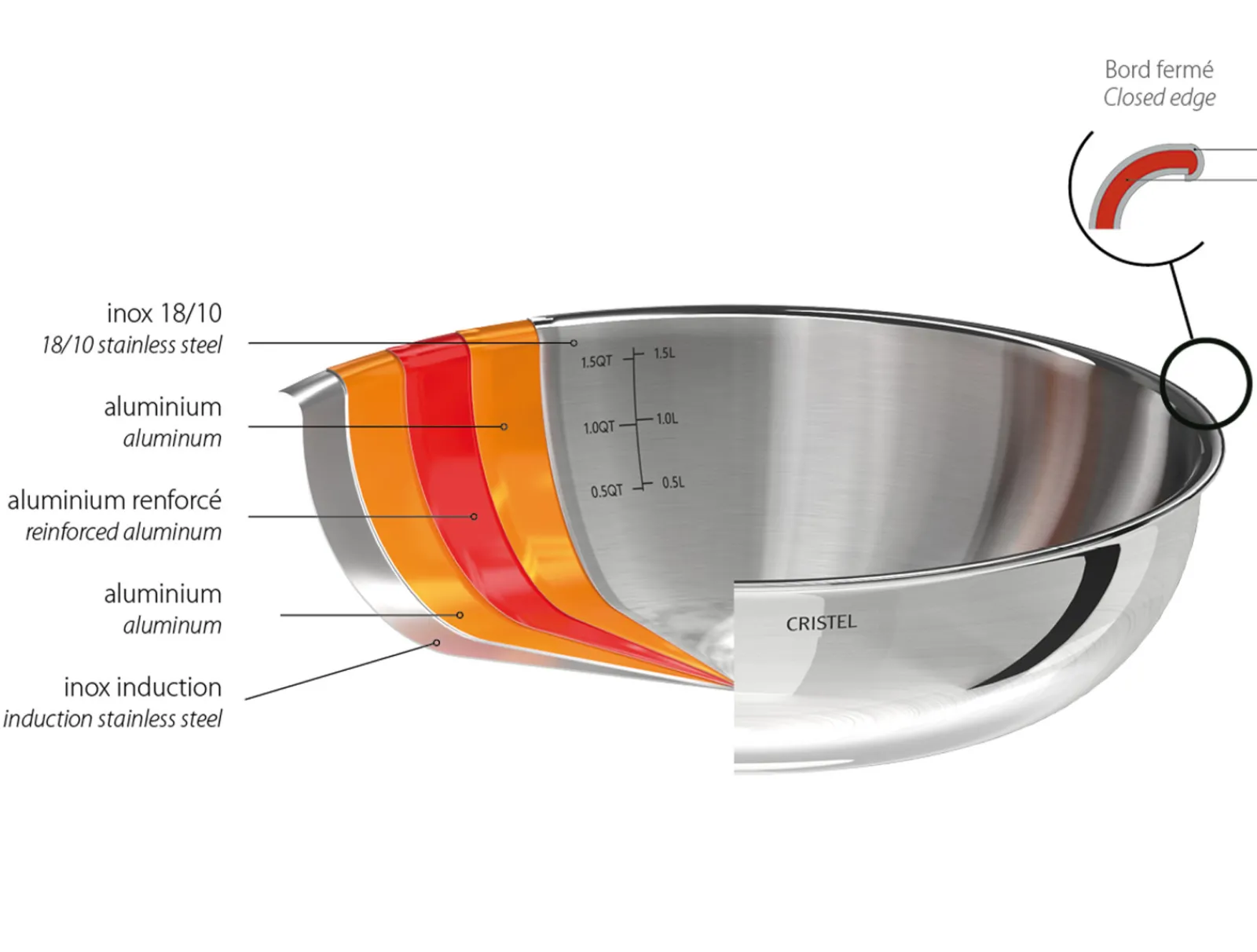 Les 5 couches superposées (inox 18/10 + 3 couches d’aluminium + inox induction), des poêles sautoirs en inox Castel’Pro, permettent une diffusion homogène de la chaleur dans tout le corps de l’ustensile, du fond jusqu’aux bords. L’absence de fond rapporté justifie une rapidité de montée et de descente de la température et facilite la cuisson des appareils les plus techniques. La forme unique tout en rondeur du corps de l’ustensile est idéale pour mélanger, mijoter, faire sauter, saisir et dorer.