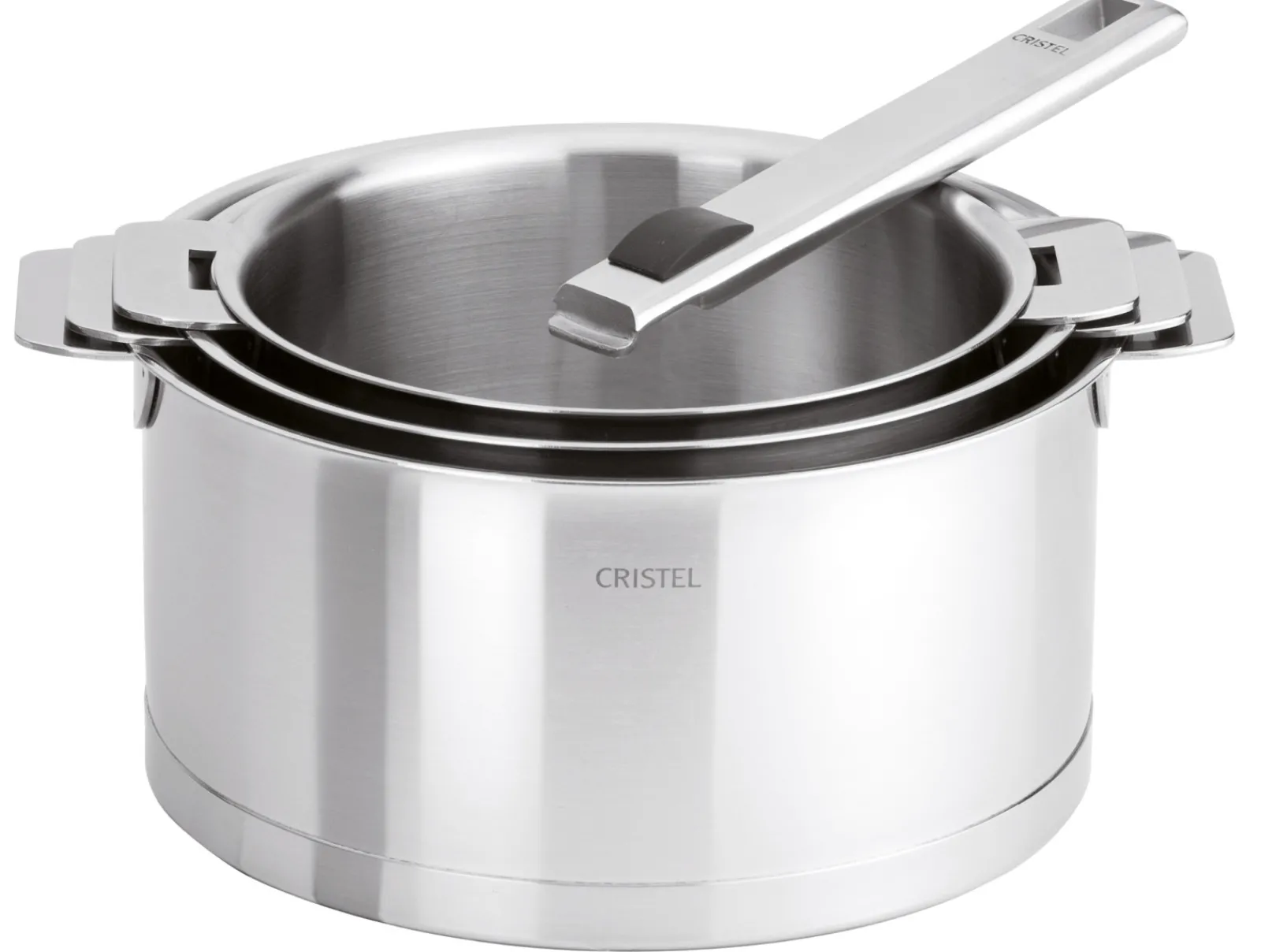 Le concept amovible permet un empilage parfait des casseroles et faitouts CRISTEL pour un gain de place appréciable dans les placards comme dans le lave-vaisselle.