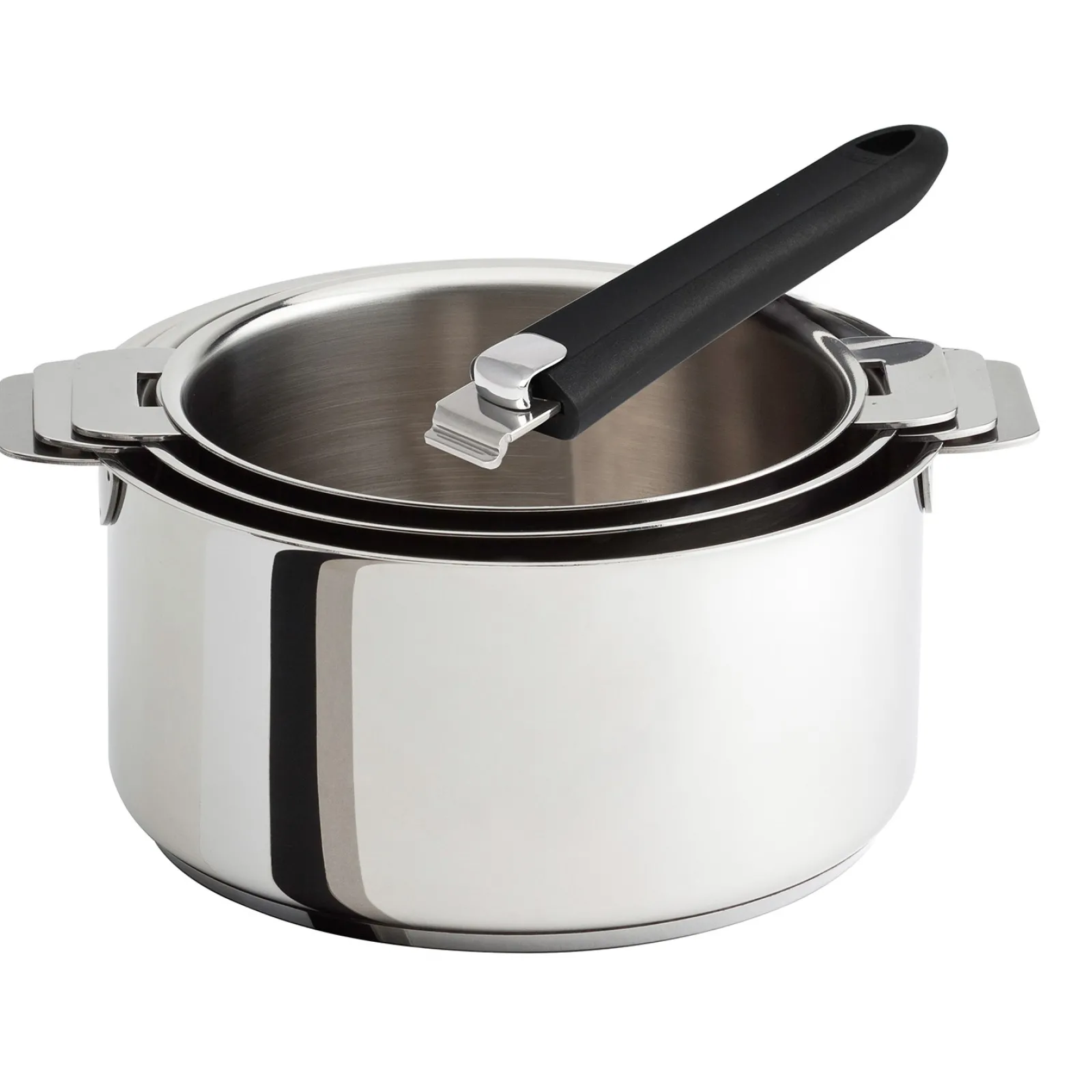 Grâce à leur poignée amovible, les casseroles CRISTEL s’empilent parfaitement, offrant un gain de place appréciable aussi bien dans les placards que dans le lave-vaisselle.