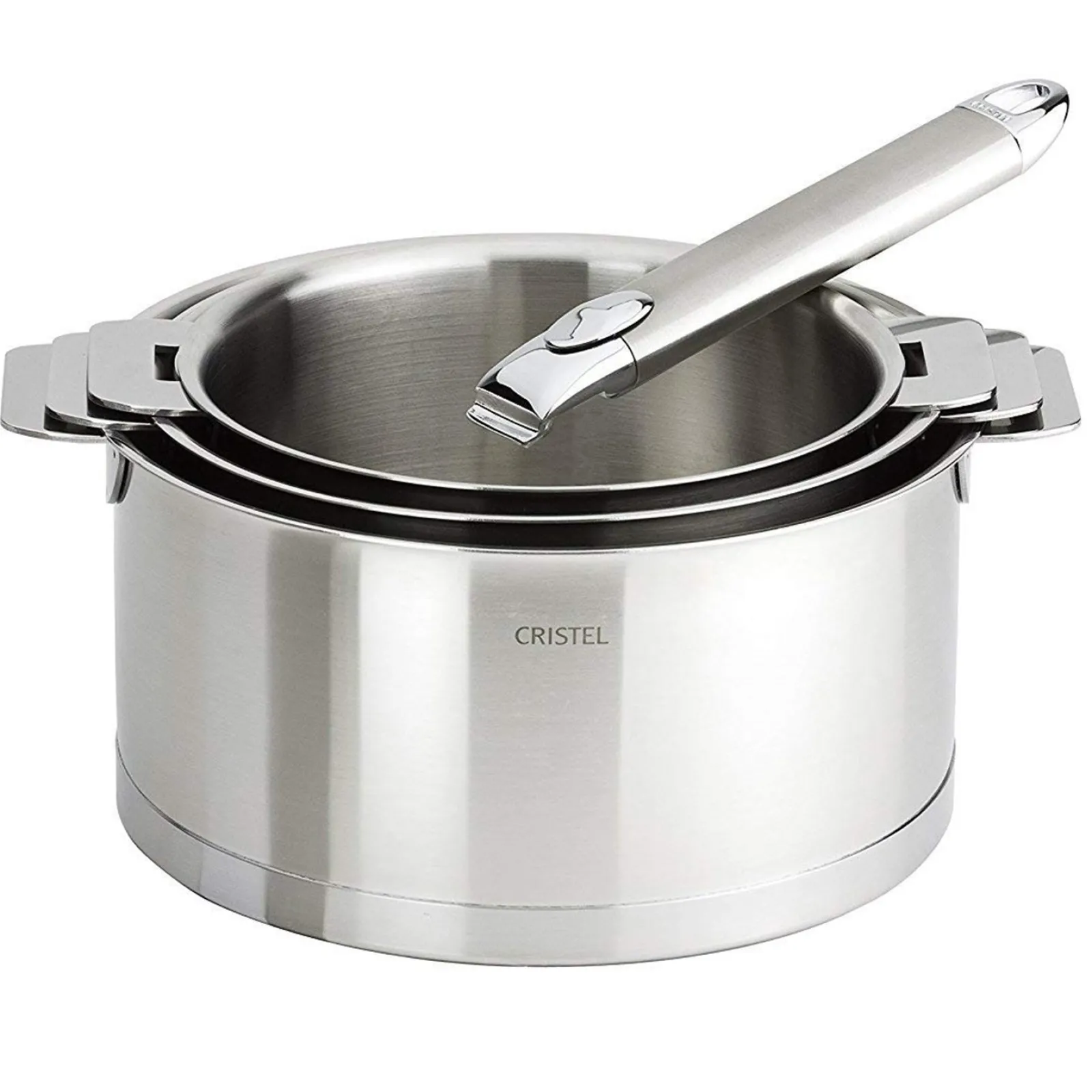 Ce Set de 3 casseroles inox Strate Amovible (ø16, 18 et 20 cm), à la finition brossée, inclut une poignée amovible en inox Zénith.