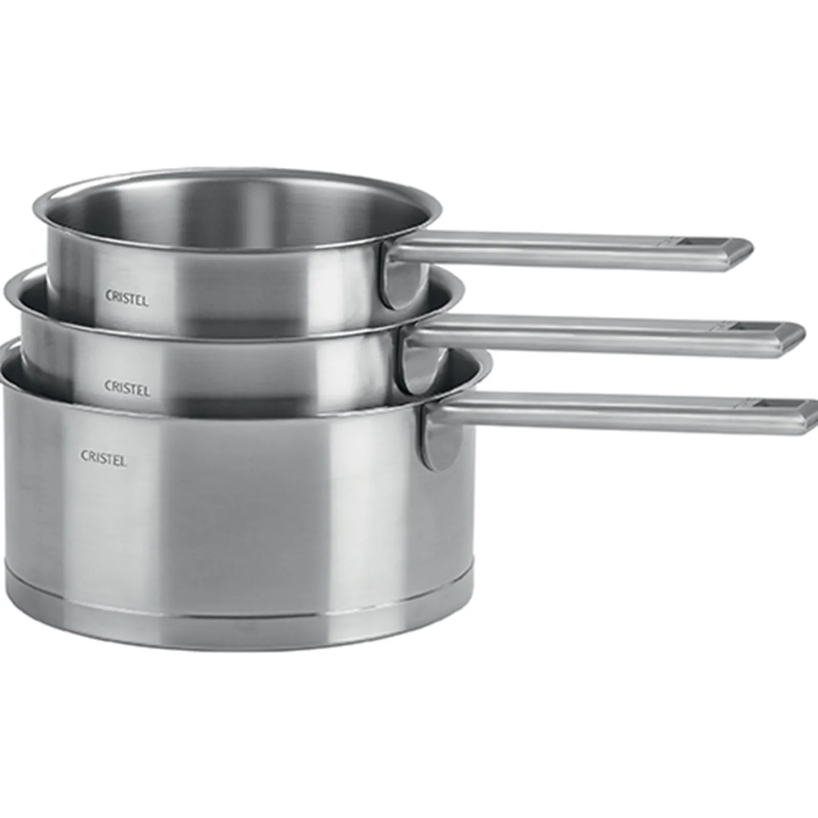 Série de trois casseroles inox 18/10, ø 16 à 20 cm, finition brossée, poignée fixe, de la collection Strate Fixe.