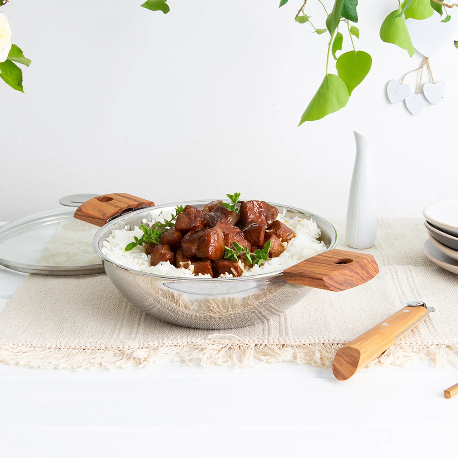 Wok inox finition brillante miroir en trilaminé (inox inducton – aluminium – inox 18/10), à poigné amovible de la collection Casteline Amovible.