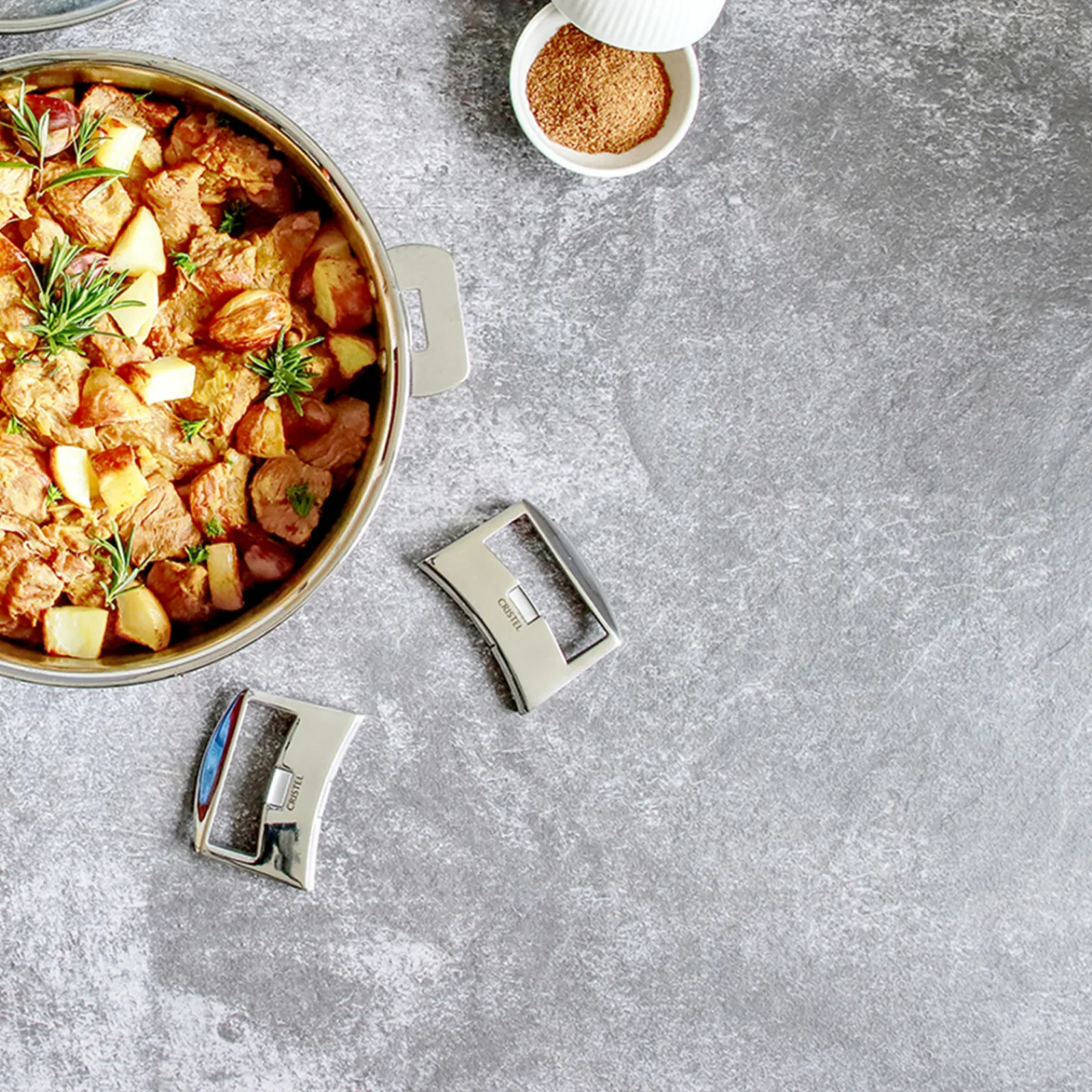 En fonte d’inox, avec un mécanisme inox, les anses amovibles Casteline assurent sécurité et modularité dans votre cuisine.