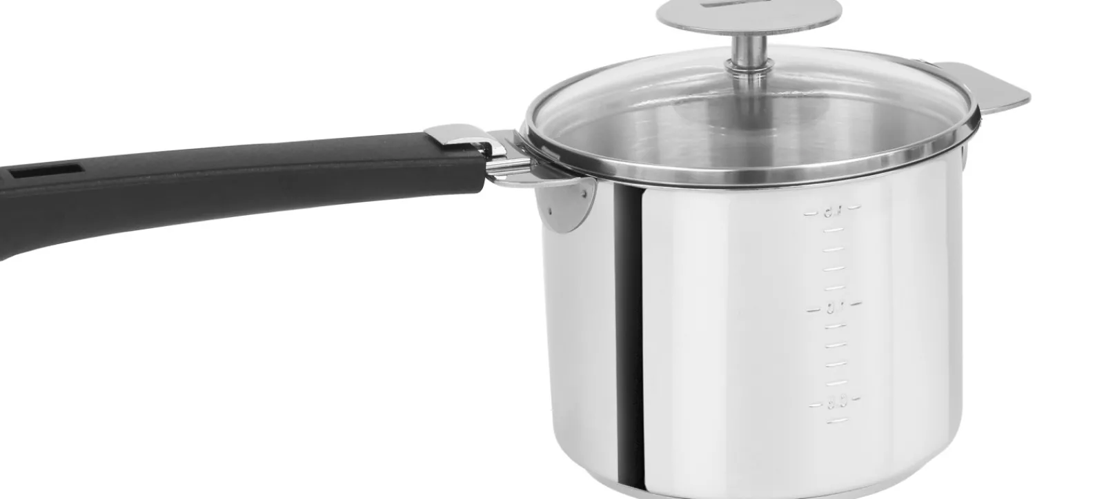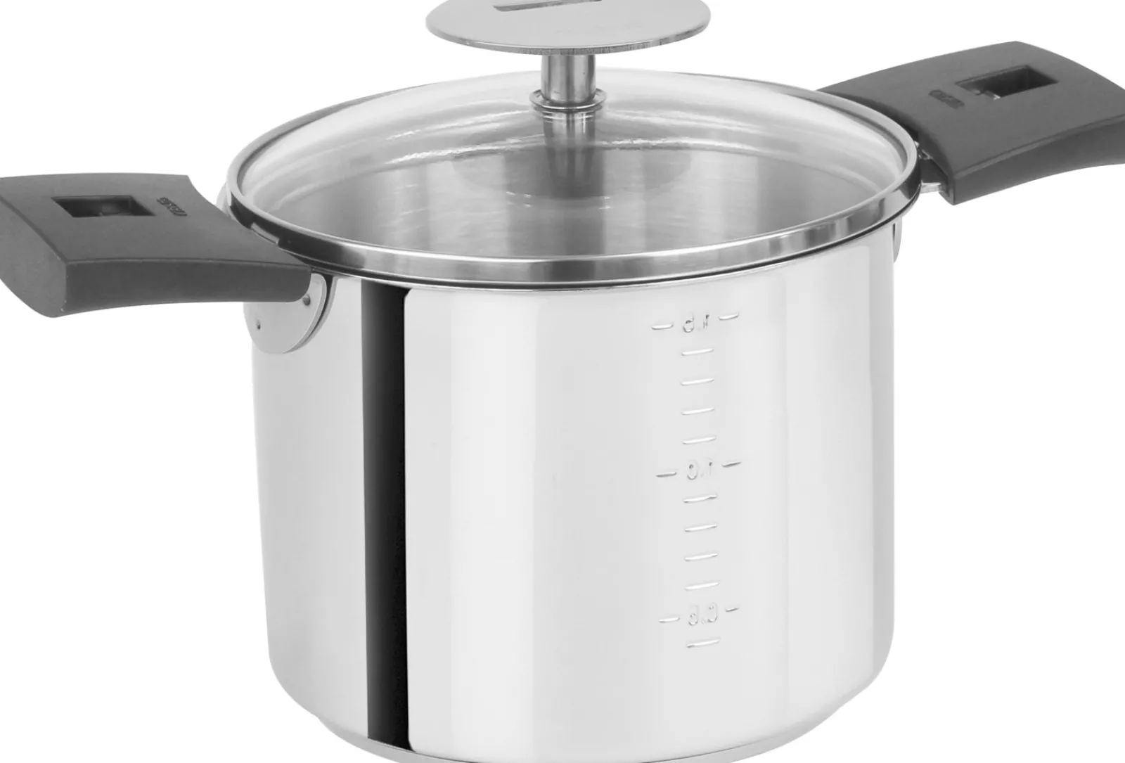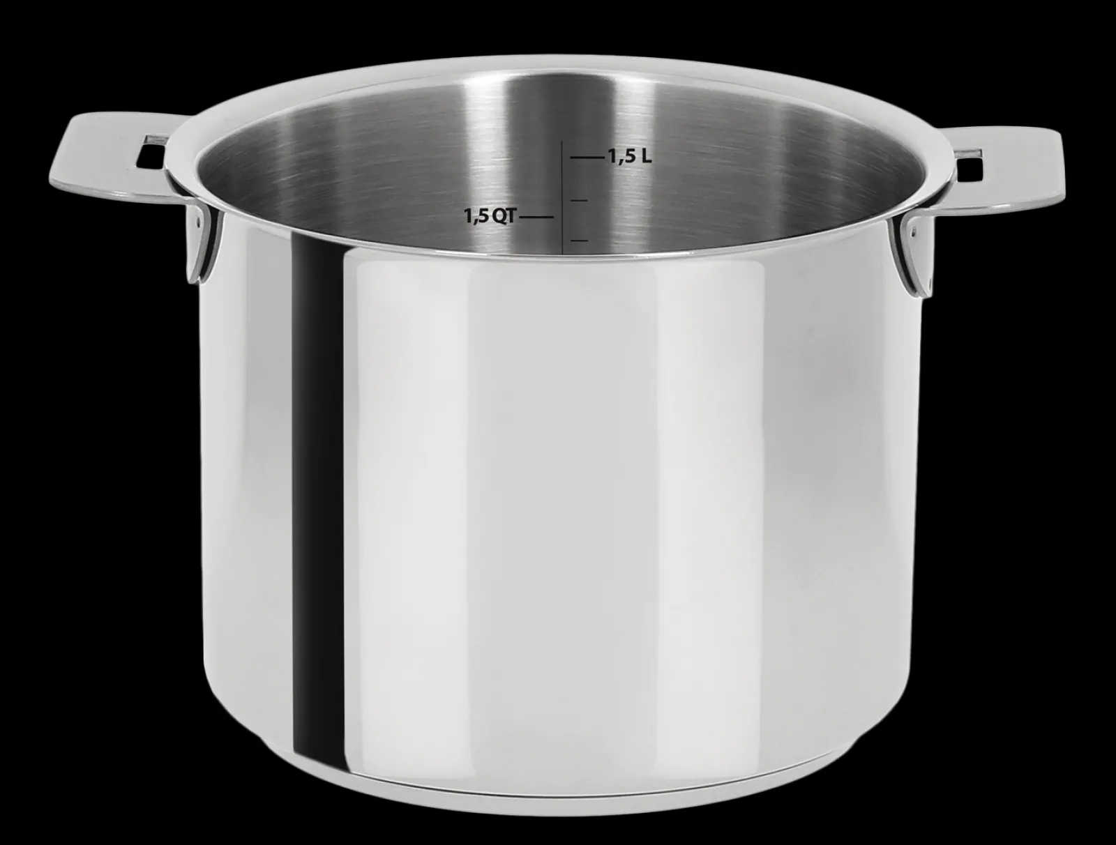 La casserole haute graduée Mutine, en inox 18/10, préservent les qualités gustatives des aliments et se nettoient facilement après la cuisson.
