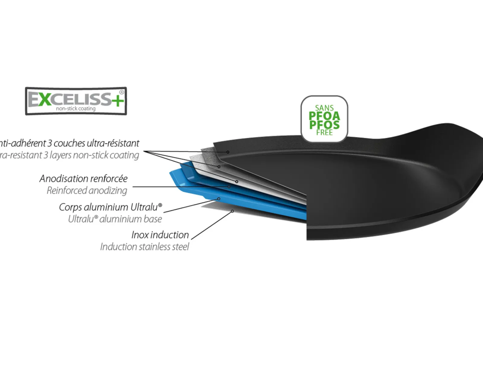 Crêpière en aluminium, poignée en fonte d’inox rivetée et revêtement anti-adhésif Exceliss®+ sans PFOA et PFOS.