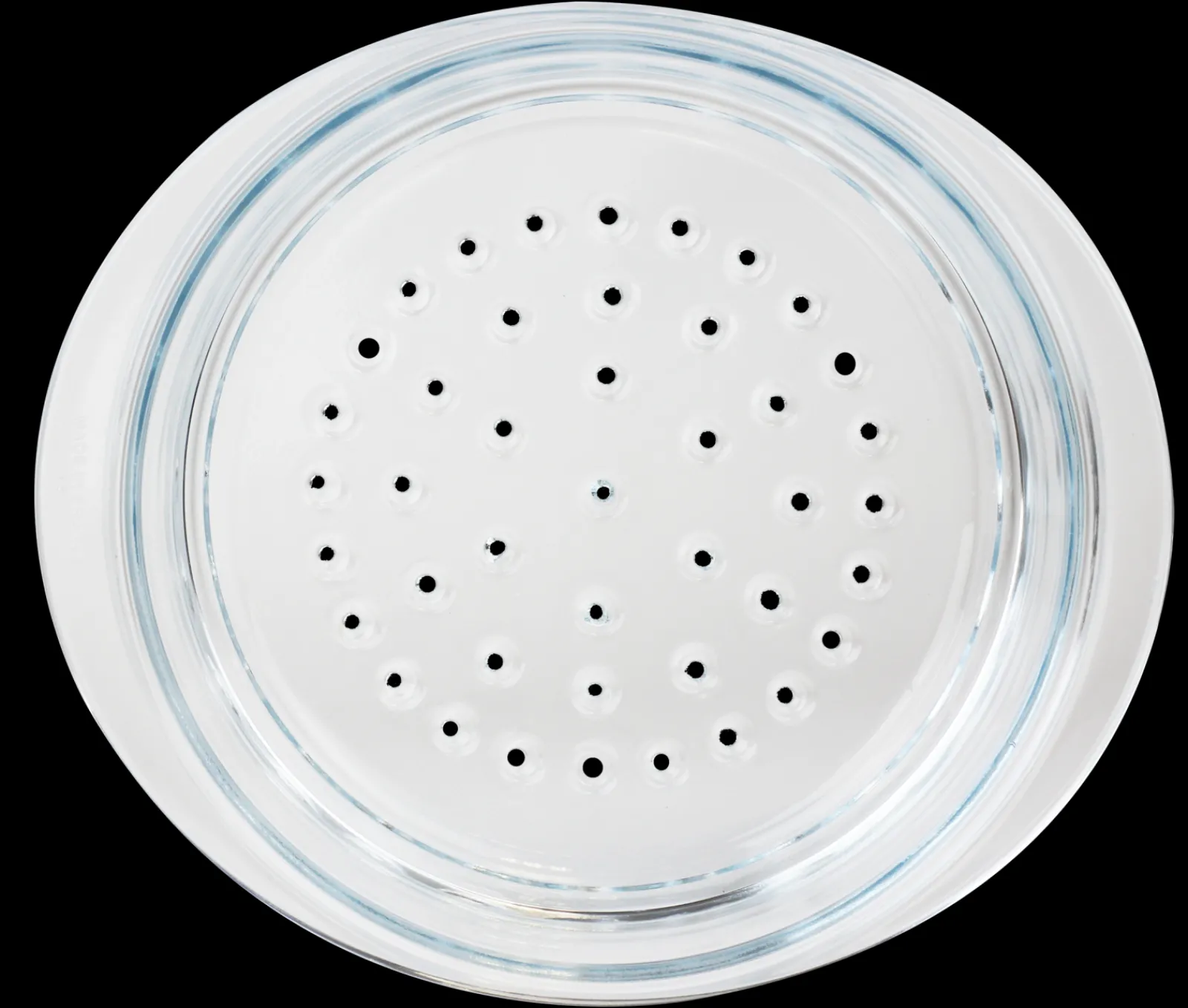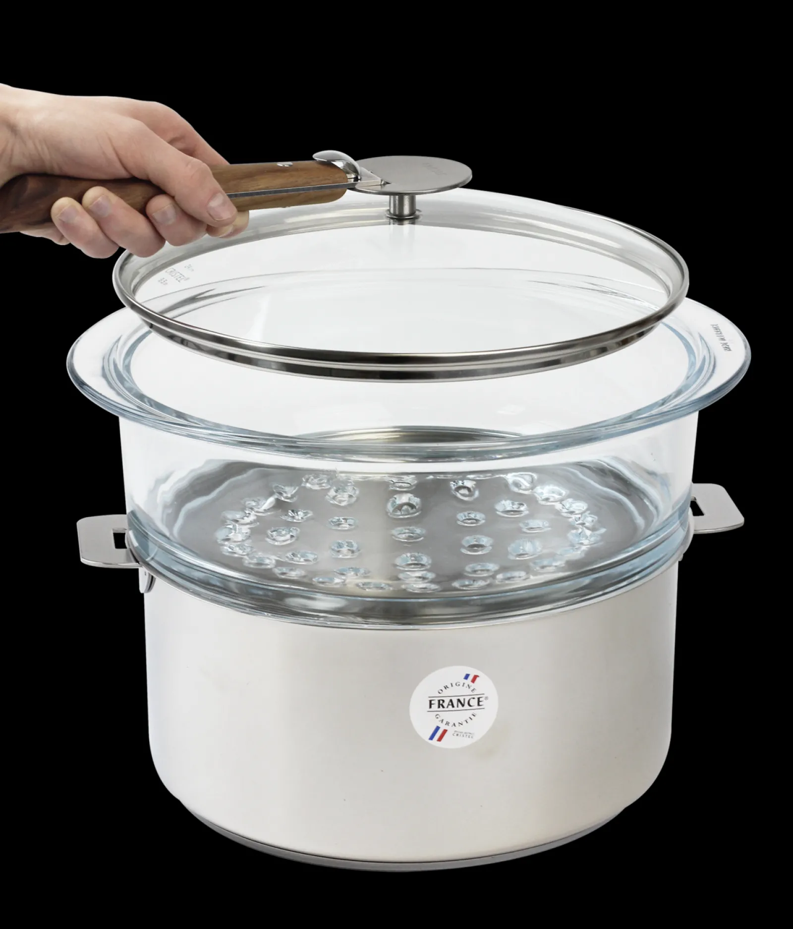 Composé d’un élément cuit-vapeur en verre et d’un couvercle.