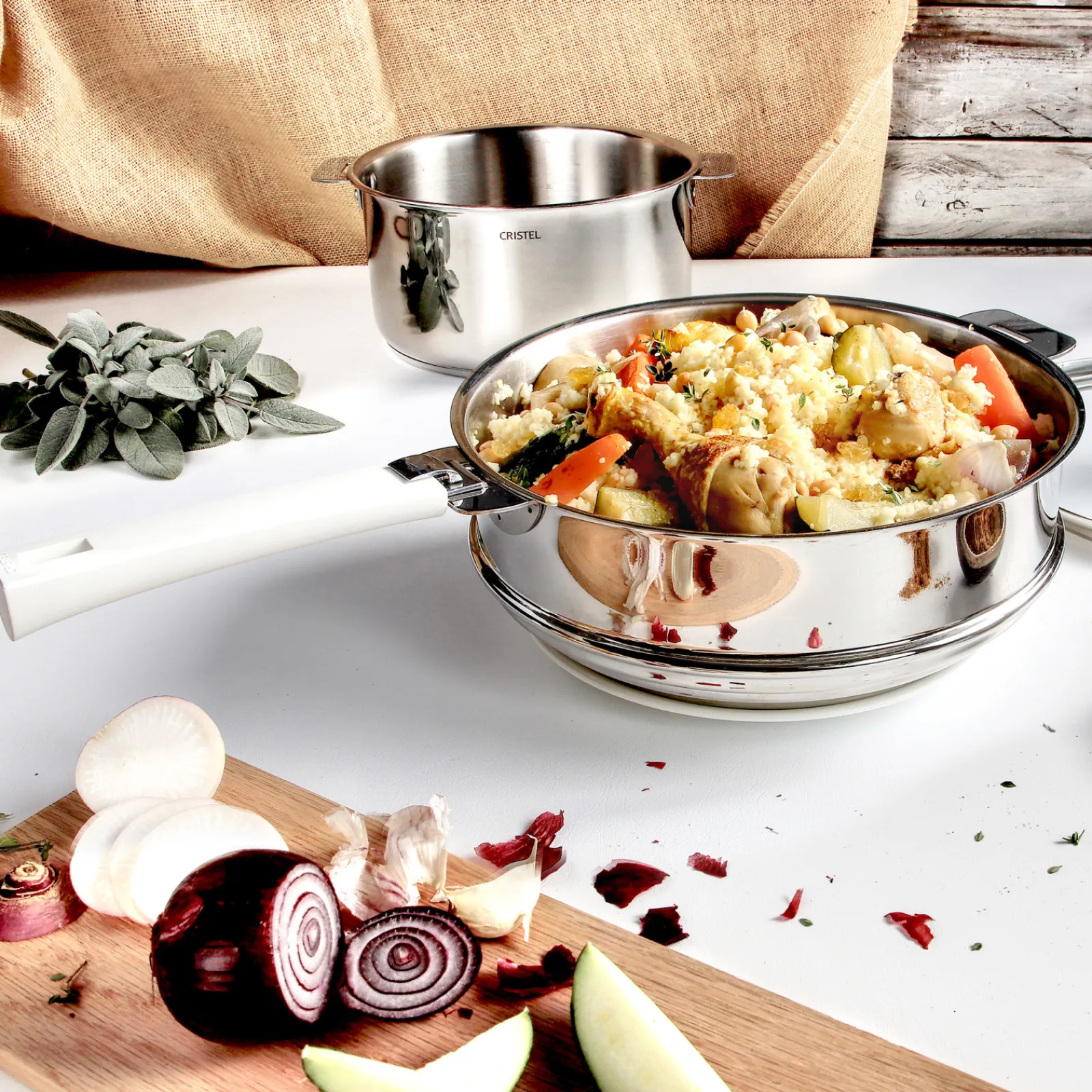 Les éléments cuit-vapeur universels Mutine, en inox 18/10, préservent les qualités gustatives des aliments et se nettoient facilement après la cuisson.