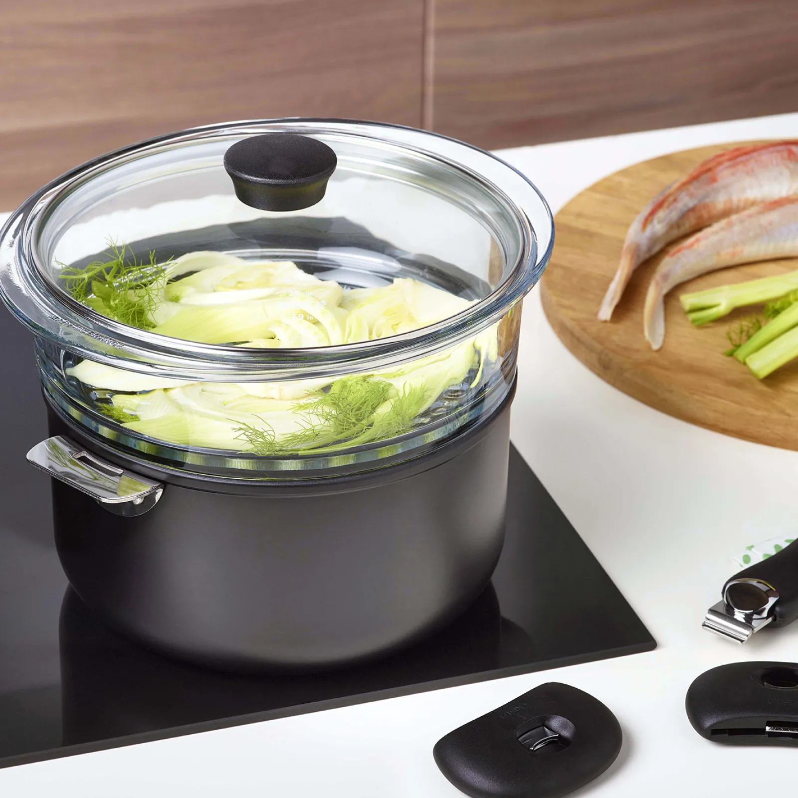 La transparence de ces deux accessoires en verre, facilite le contrôle de la cuisson sans que la vapeur ne s’échappe.