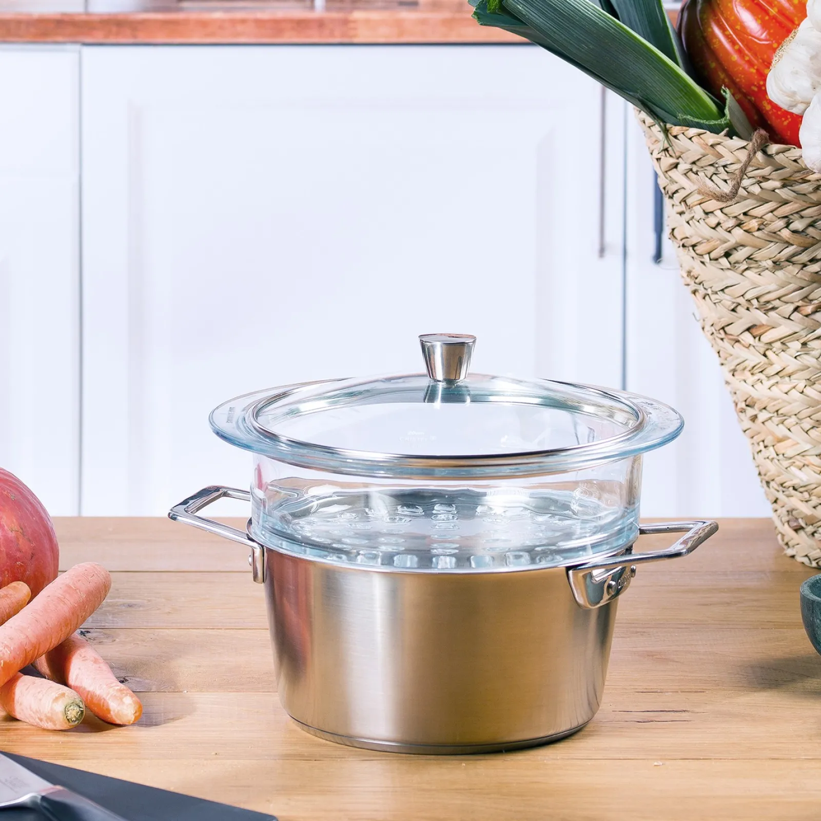 Le couvercle en verre trempé, avec cerclage et bouton en inox, résiste à des températures allant jusqu’à 220°C et sera votre allié pour une cuisson saine et à couvert.