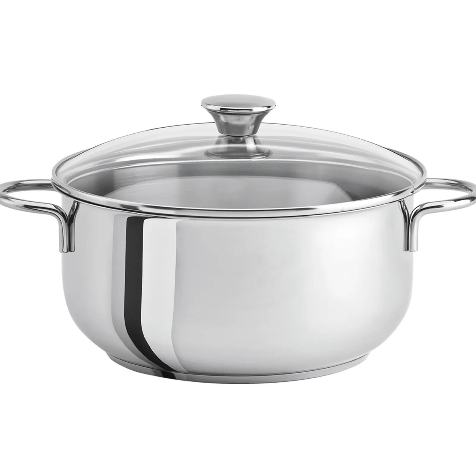 Faitout inox 18/10, finition brillant miroir, anses fil inox, et couvercle en verre bombé cerclé inox.