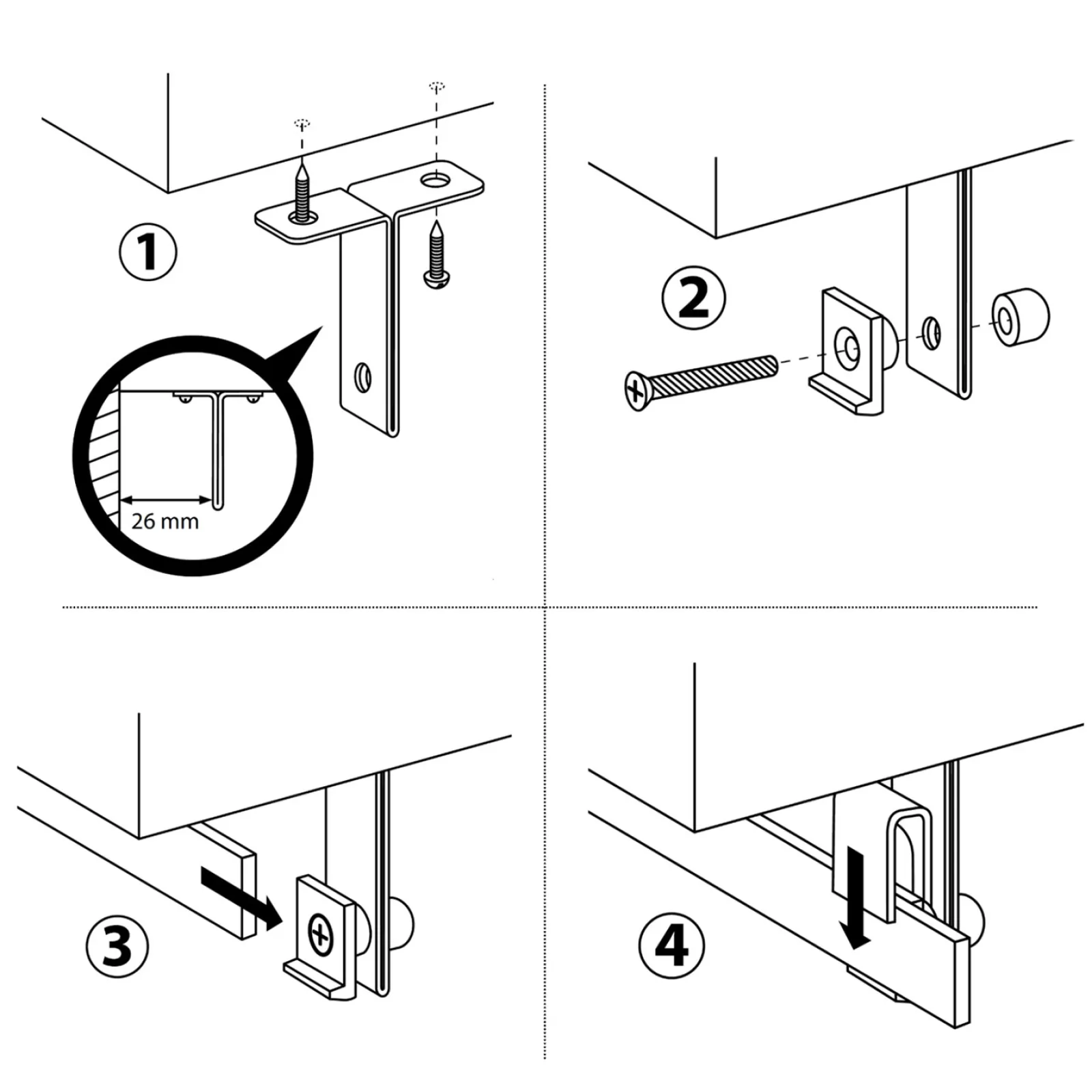 Kit de fixation sous placard pour barre Panoply.NB : ce kit ne contient qu’une seule fixation. Vendu à l’unité.