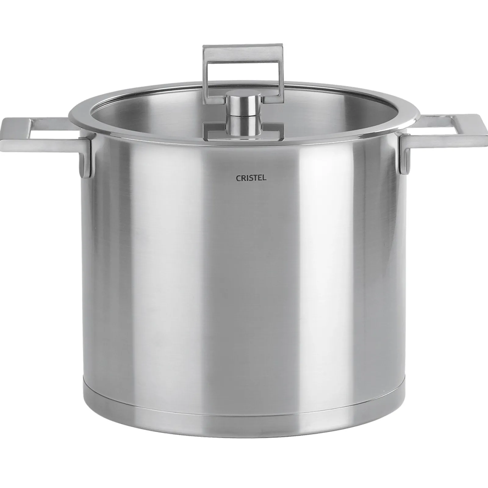 Marmite inox 18/10, finition brossée, anses en fonte d’inox, et couvercle plat en verre cerclé inox.