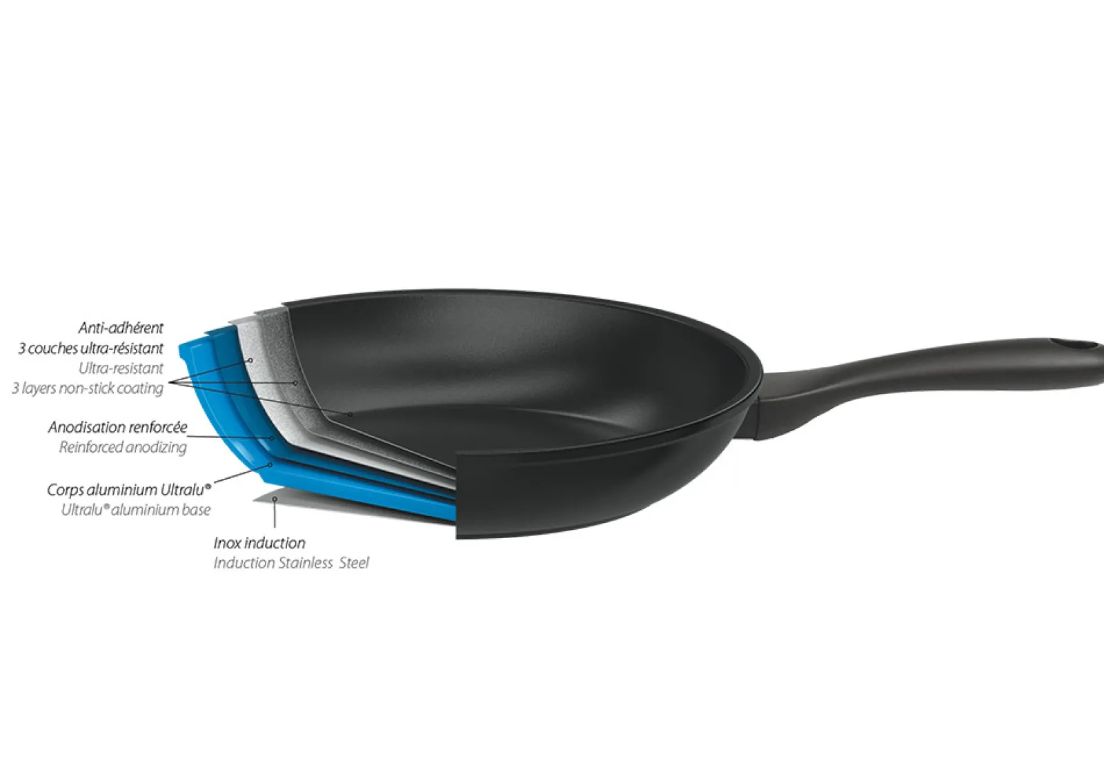 Poêle en aluminium, poignée en bakélite et revêtement anti-adhésif Exceliss®+ sans PFOA.