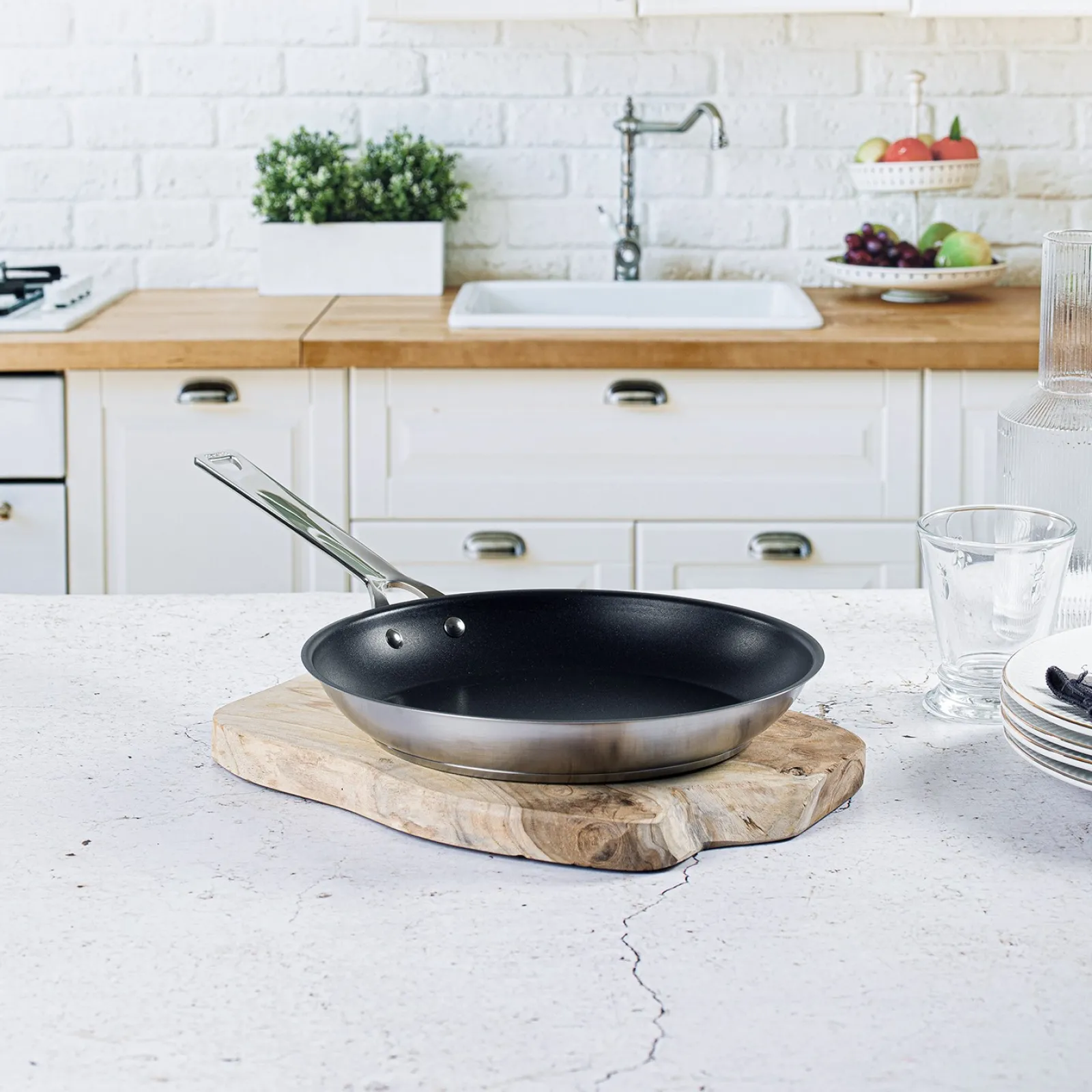 Équipée d’un fond rapporté thermo-diffuseur fabriqué en trois couches superposées (inox induction – aluminium – inox 18/10) et d’un revêtement anti-adhésif Exceliss+ garanti sans PFOA ni PFOS, elle assure une diffusion uniforme de la chaleur sur toute la surface du fond, permettant ainsi de cuisiner sans que les aliments délicats n’accrochent, tels que le poisson, les œufs ou les pommes de terre.
