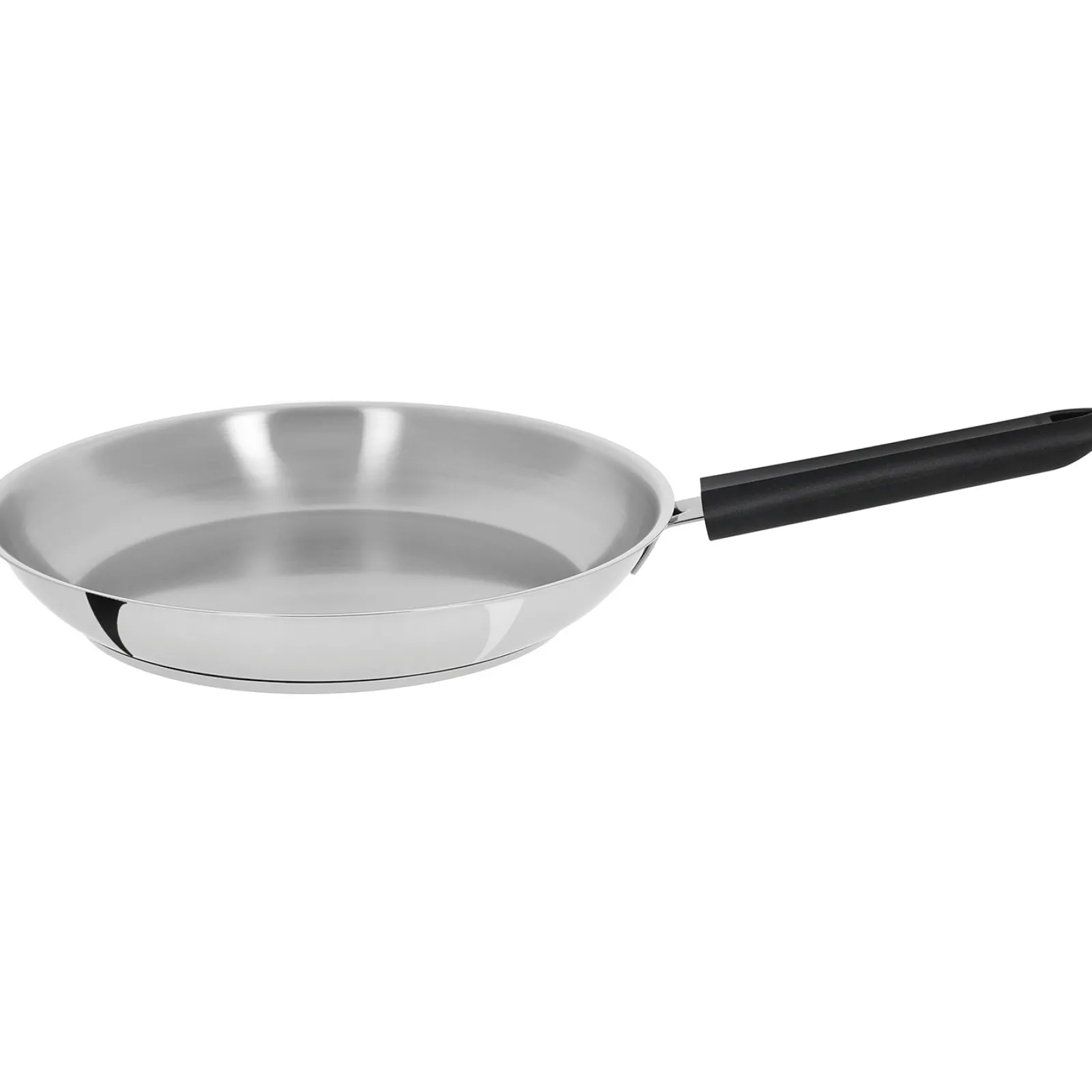 Poêle inox 18/10, finition brillant miroir, poignée fixe en bakélite noire, de la collection Mutine Fixe.