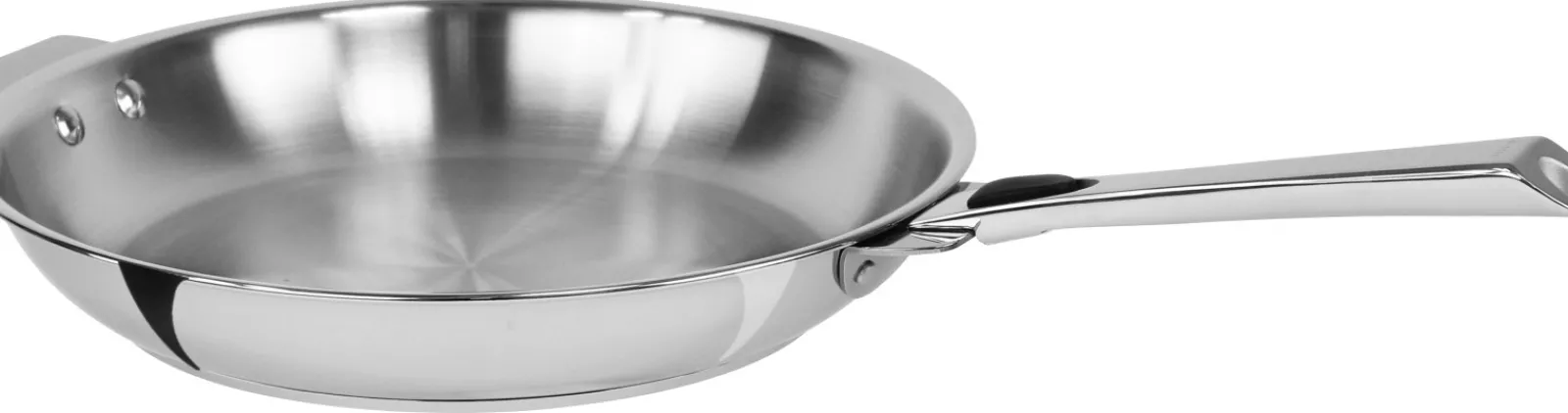Poêle inox finition brillant miroir technologie Multiply trilaminé, inox / aluminium / inox sur les côtés et 5 couches inox / aluminium / inox / aluminium / inox induction sur le fond. Poêle à poignée amovible de la collection Casteline Amovible.