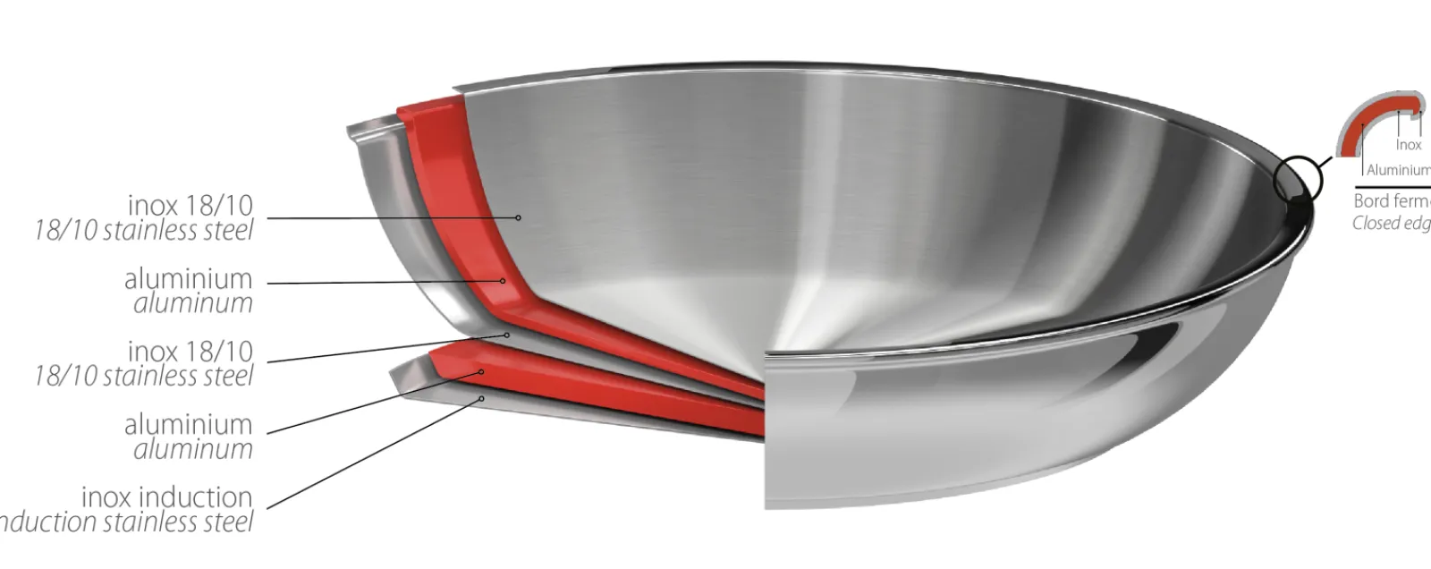 Cette construction spécifique des poêles Casteline, permet une diffusion intégrale de la chaleur dans tout le corps de l’ustensile de cuisson et non plus seulement au niveau du fond thermo-diffuseur comme pour les autres collections inox CRISTEL.