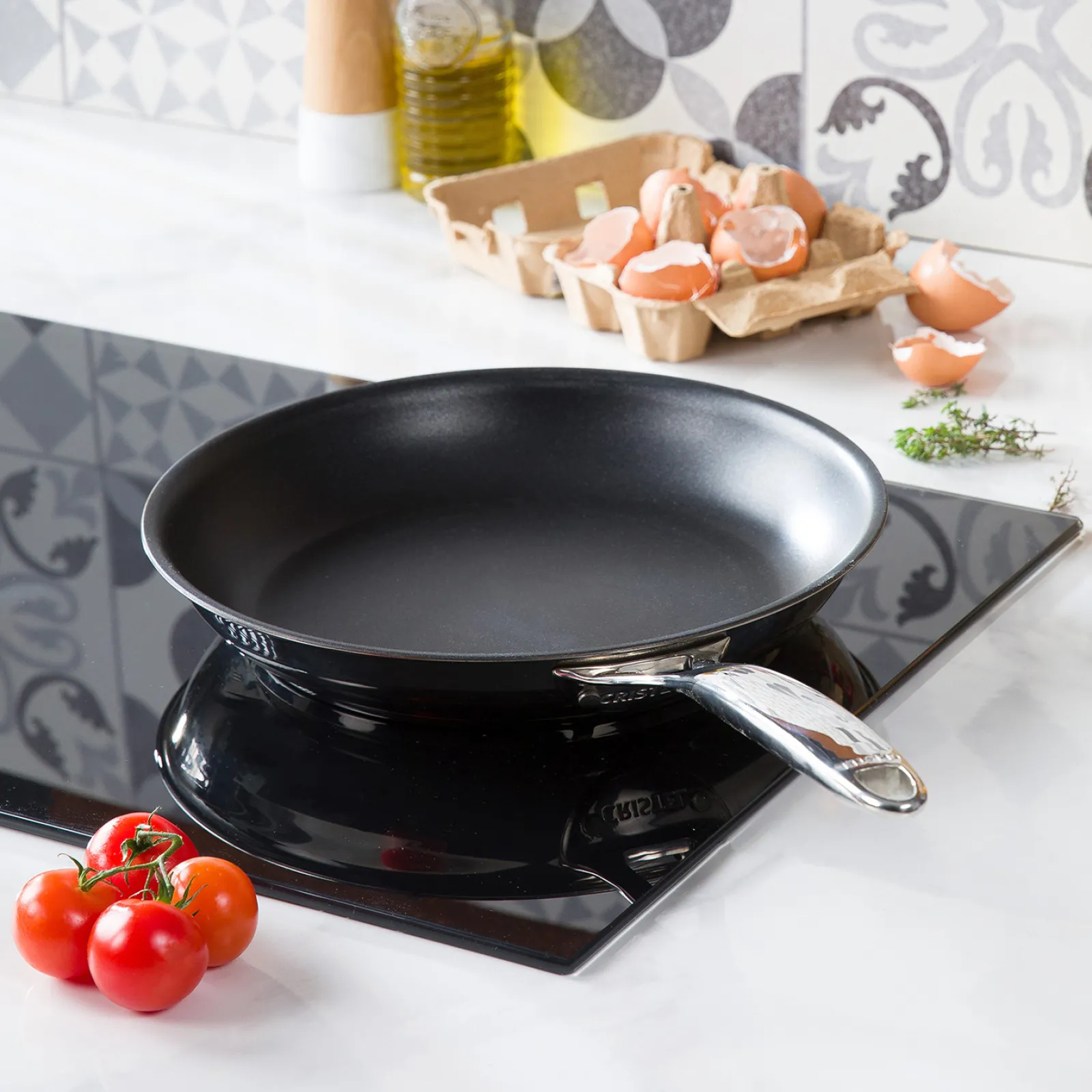 La poignée en inox massif athermique, parfaitement liée au corps de la poêle grâce aux rivets inox, ne retient pas la chaleur sur plaque vitrocéramique et induction.