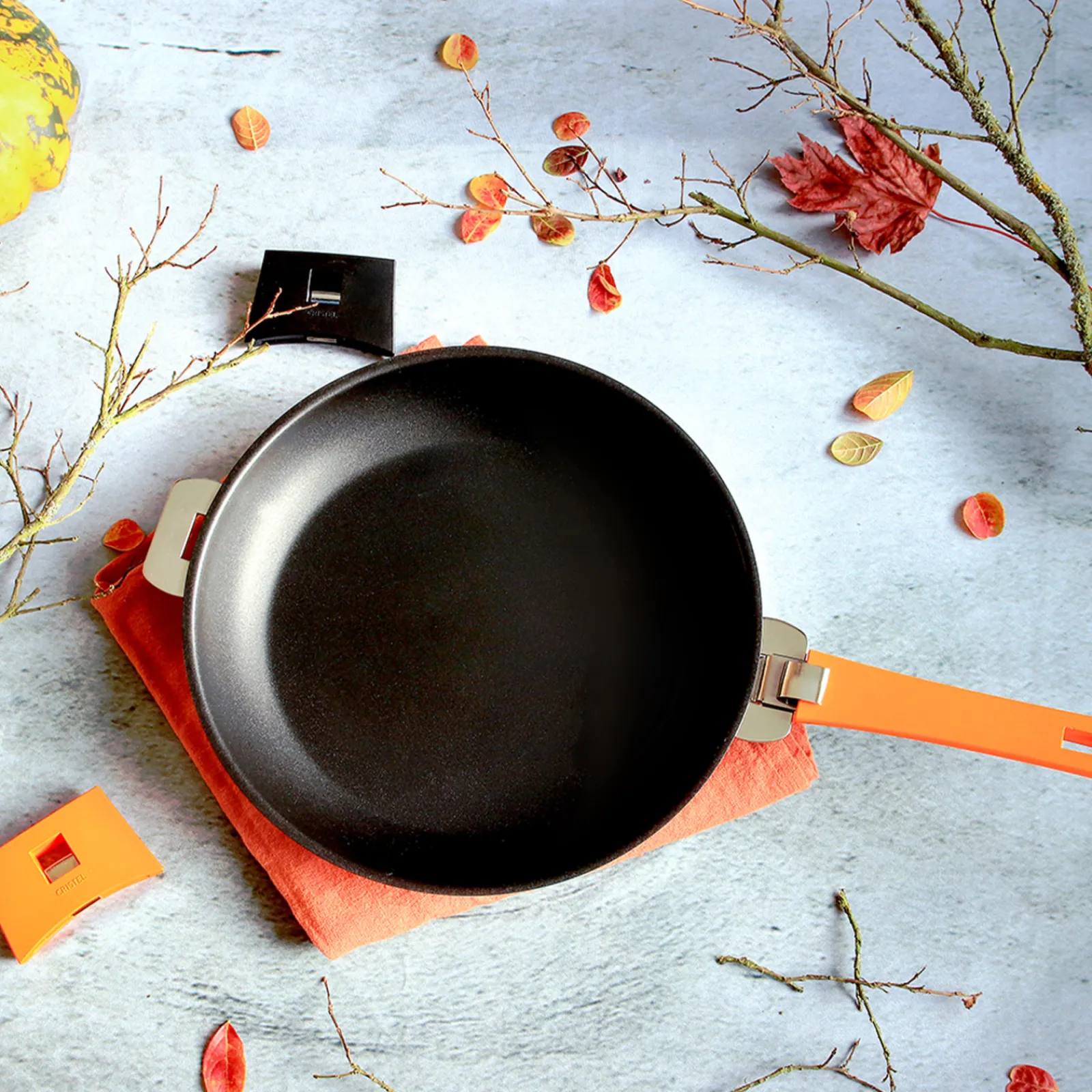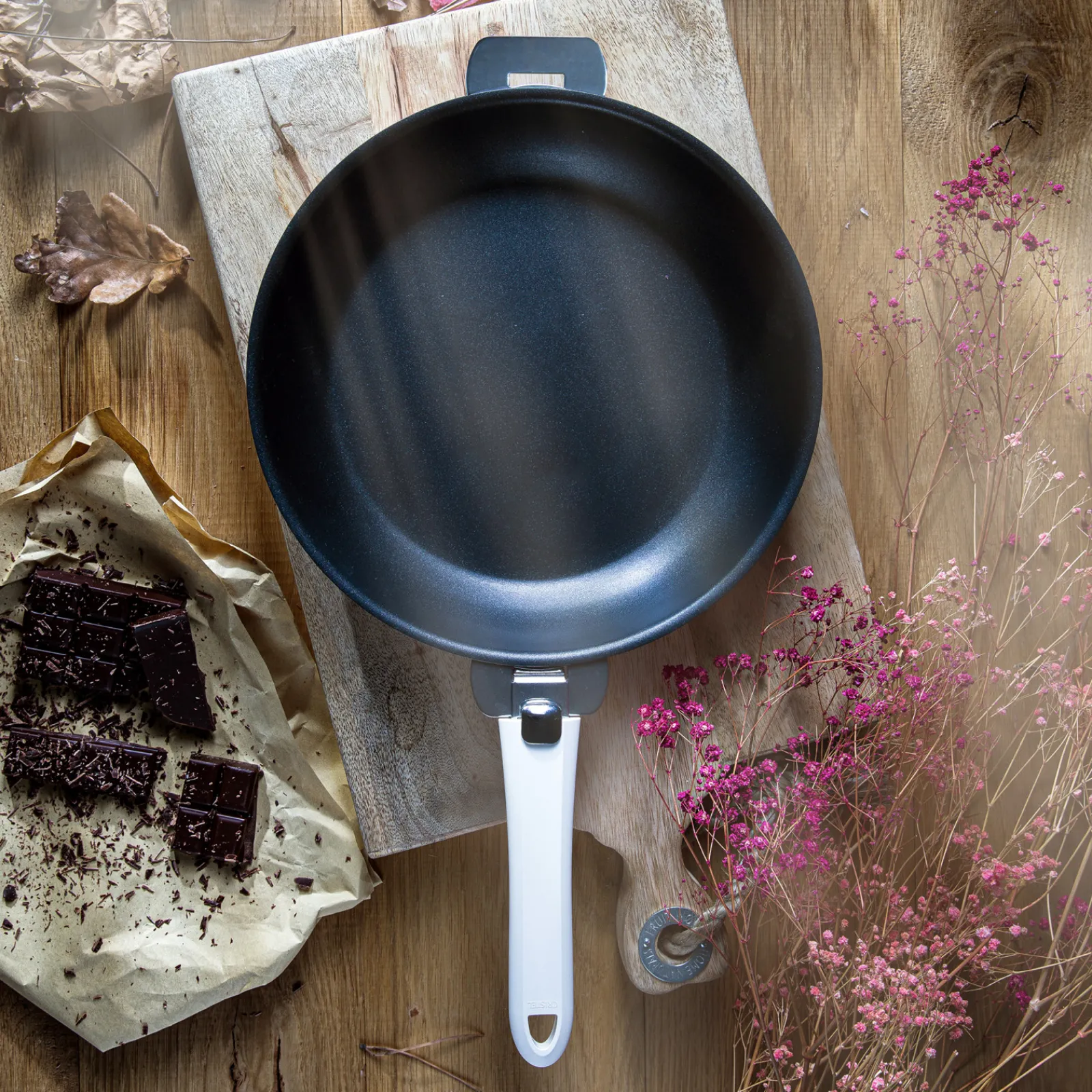 Poêle en inox 18/10 à poignée amovible, finition brillant miroir, avec revêtement anti-adhésif Exceliss+. Collection Mutine Amovible.