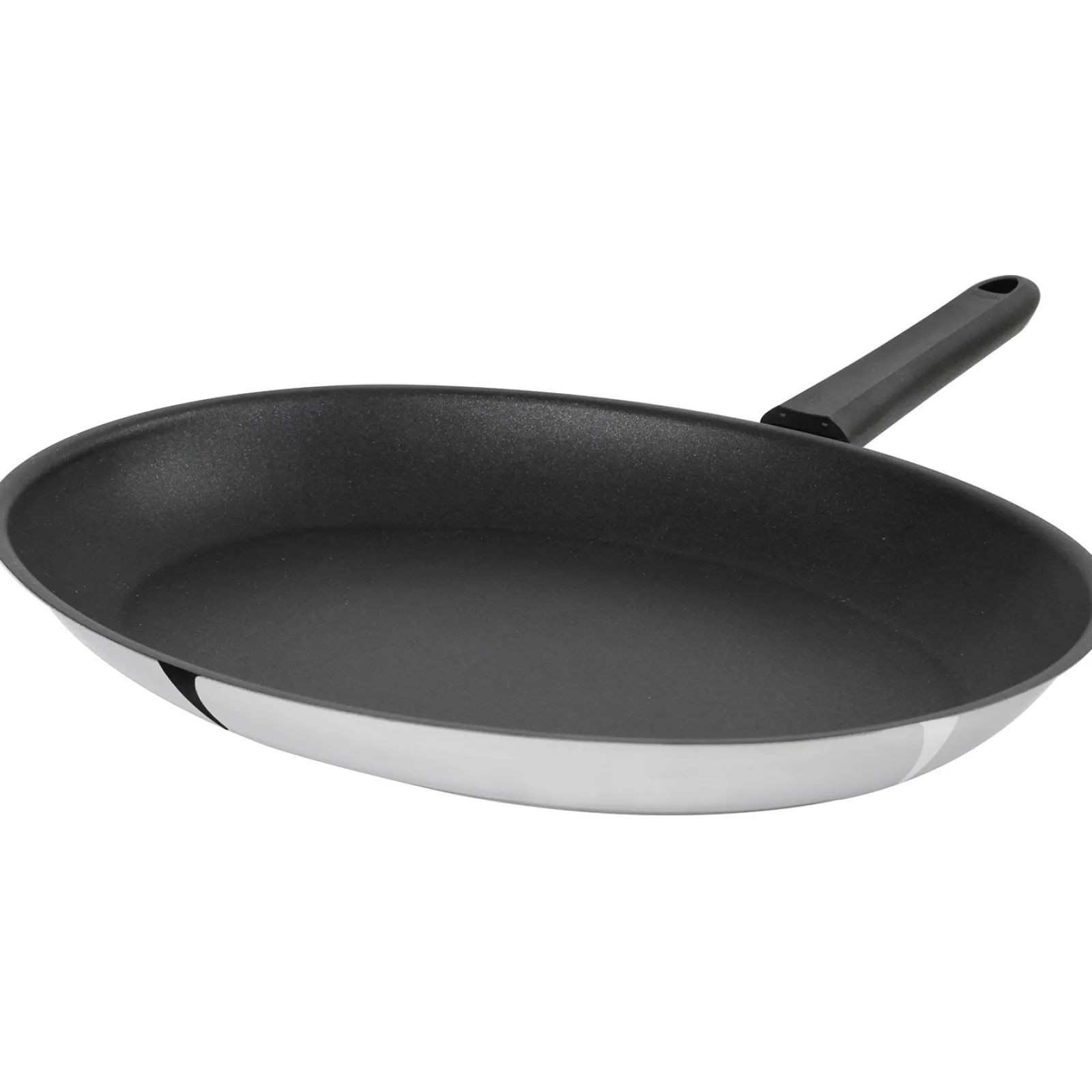 Poêle ovale en inox 18/10, finition brillant miroir, avec revêtement anti-adhésif Exceliss. Poignée fixe en bakélite noire, de la collection Mutine Fixe.