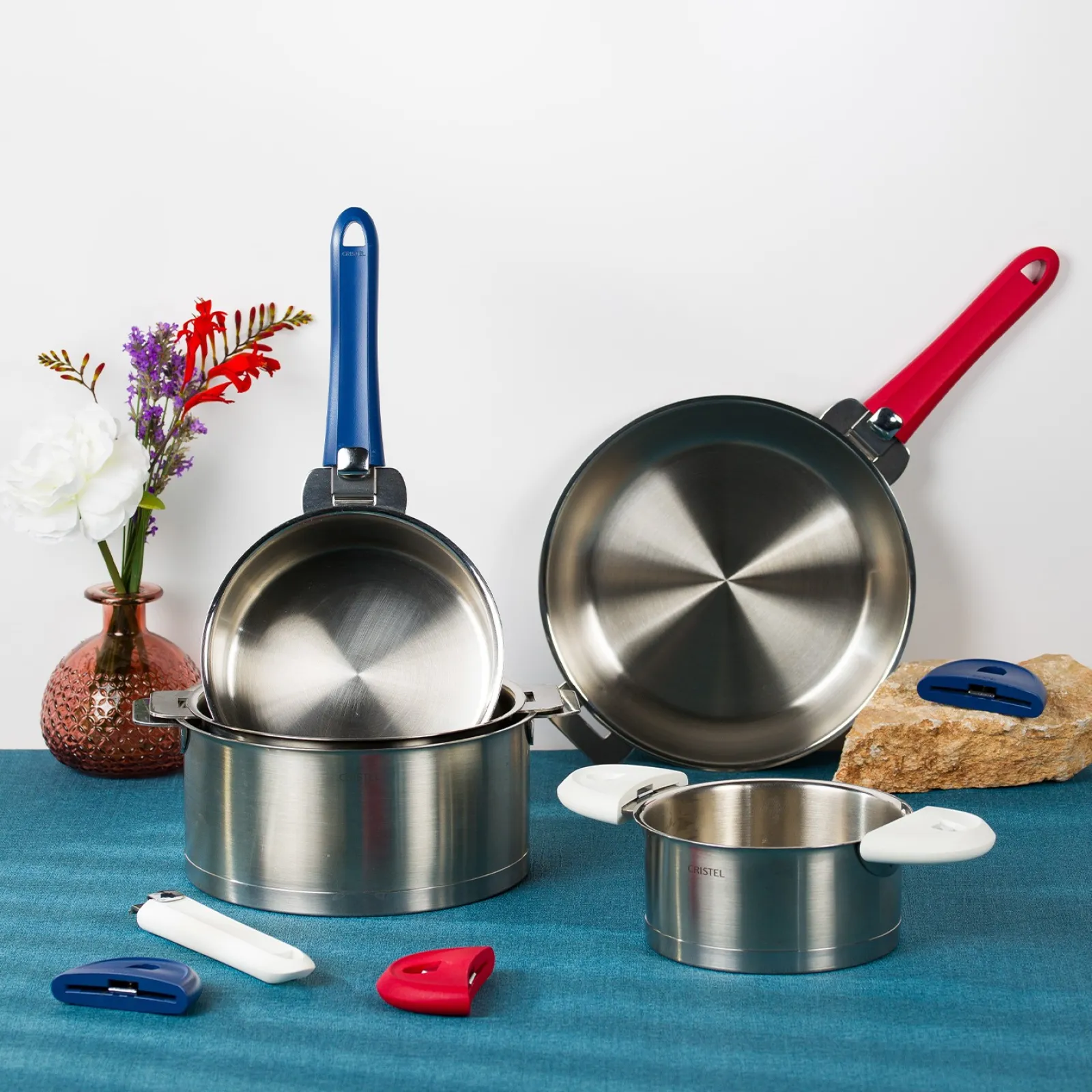 Dernières nées des poignées amovibles CRISTEL, les poignées Mutine Evolution sont associées aux ustensiles de cuisson inox de la collection Mutine Amovible mais s’adaptent également à toutes les casseroles, poêles, … ou encore les couvercles des différentes collections amovibles CRISTEL.