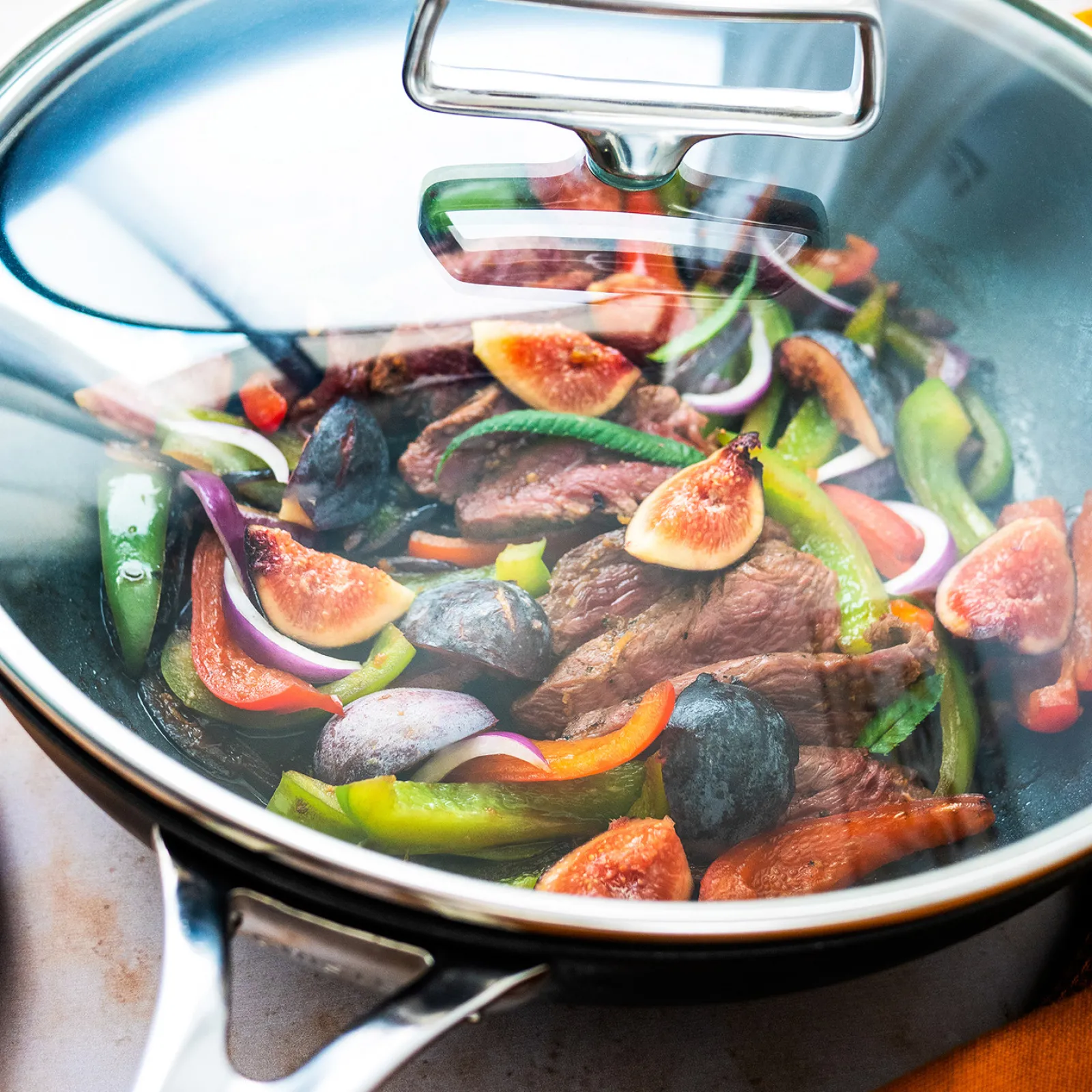 Sauteuse aluminium Castel’Pro Ultralu et revêtement antiadhésif Exceliss®+ sans PFOA et sans PFOS. Poignée fixe en fonte d’inox, rivetée.