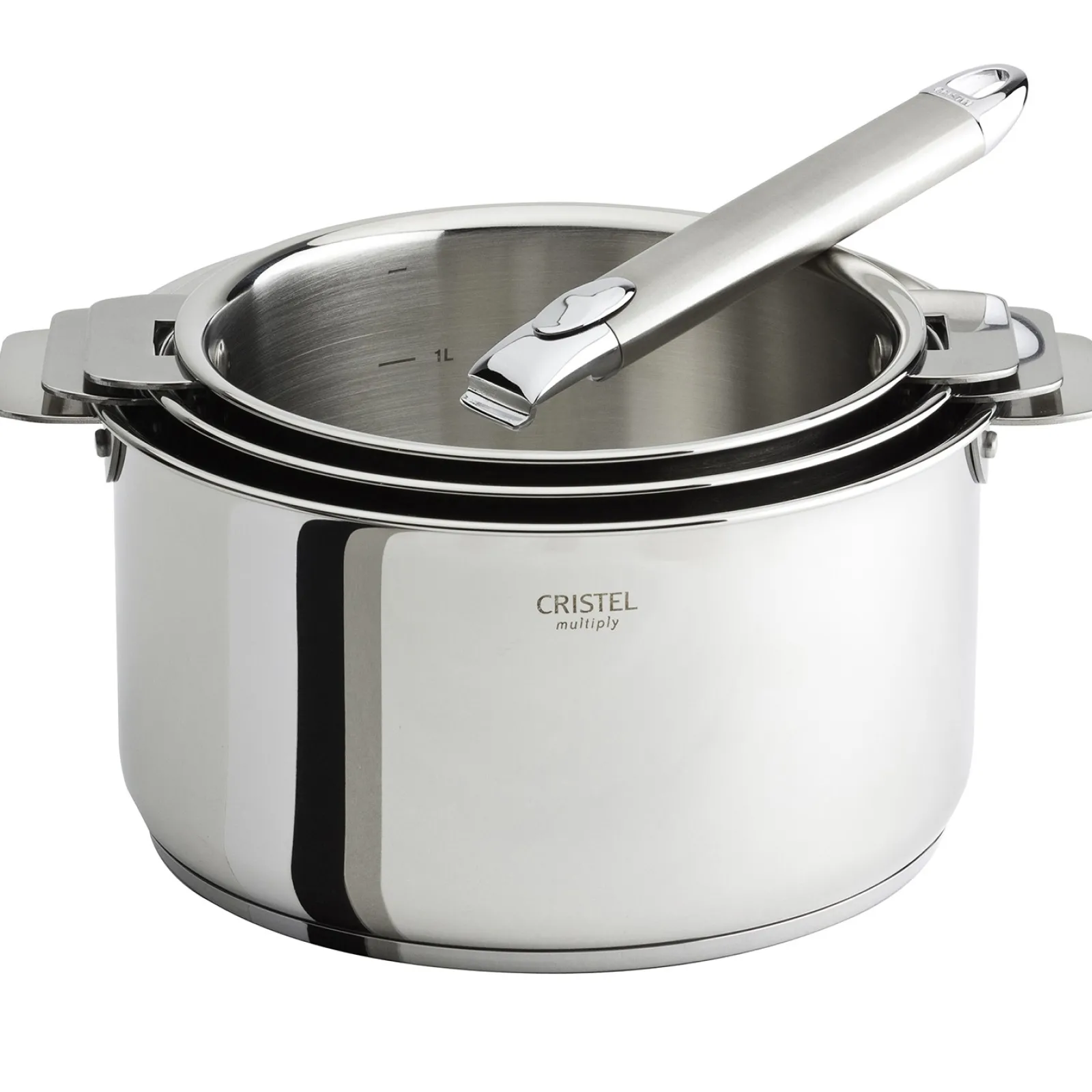 Le concept amovible permet un empilage parfait des casseroles et faitouts CRISTEL pour un gain de place appréciable, dans les placards comme dans les lave-vaisselle.