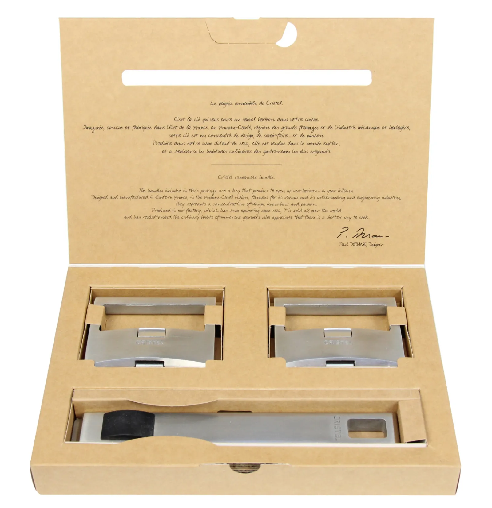 Pour les amoureux de l’inox, CRISTEL a imaginé des anses et une poignée amovible en inox brossé, parfaitement assorties aux casseroles et autres ustensiles de cuisson de sa collection Strate Amovible.